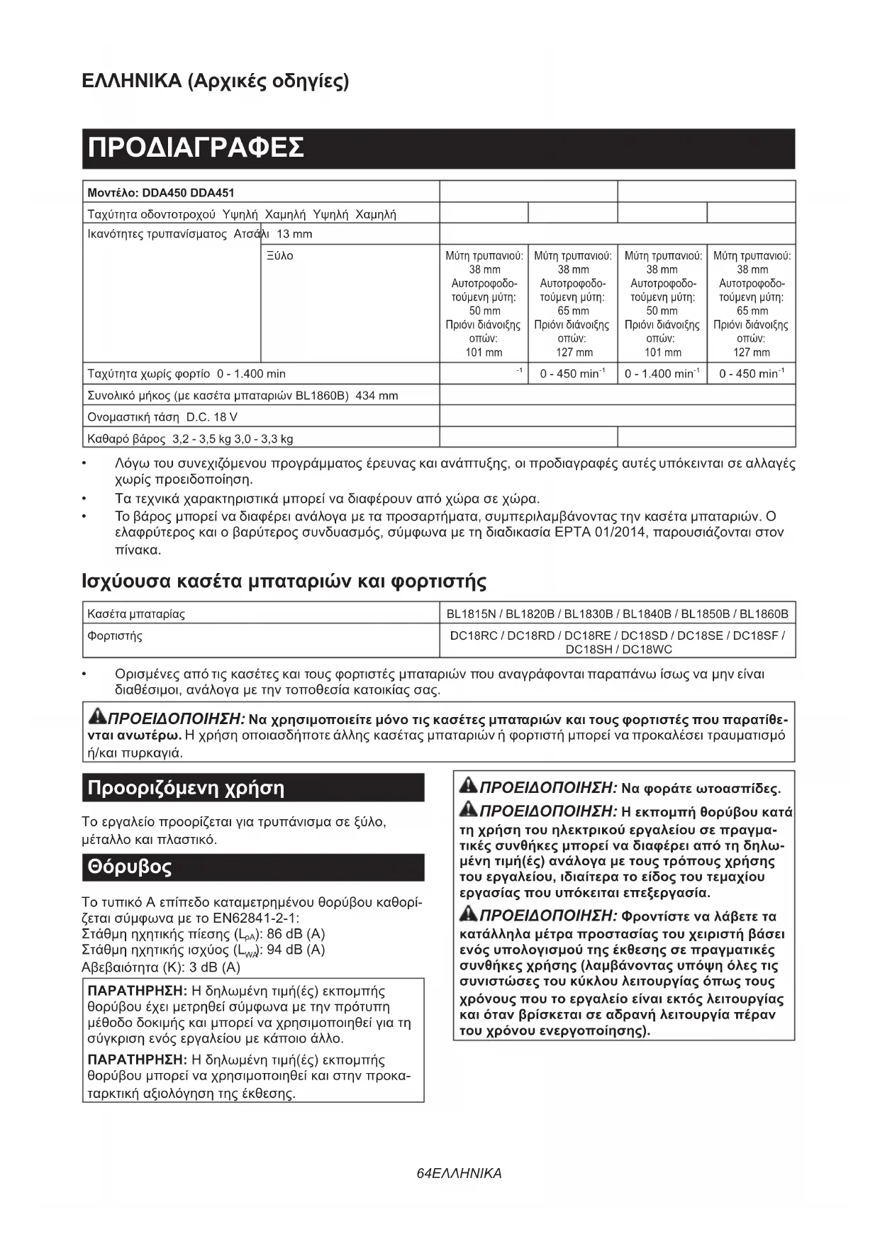 Συνολικόμήκος(μεκασέταμπαταριώνBL1860B) 434 mm Ονομαστικήτάση D.C. 18 V Καθαρόβάρος 3,2 - 3,5 kg 3,0 - 3,3 kg