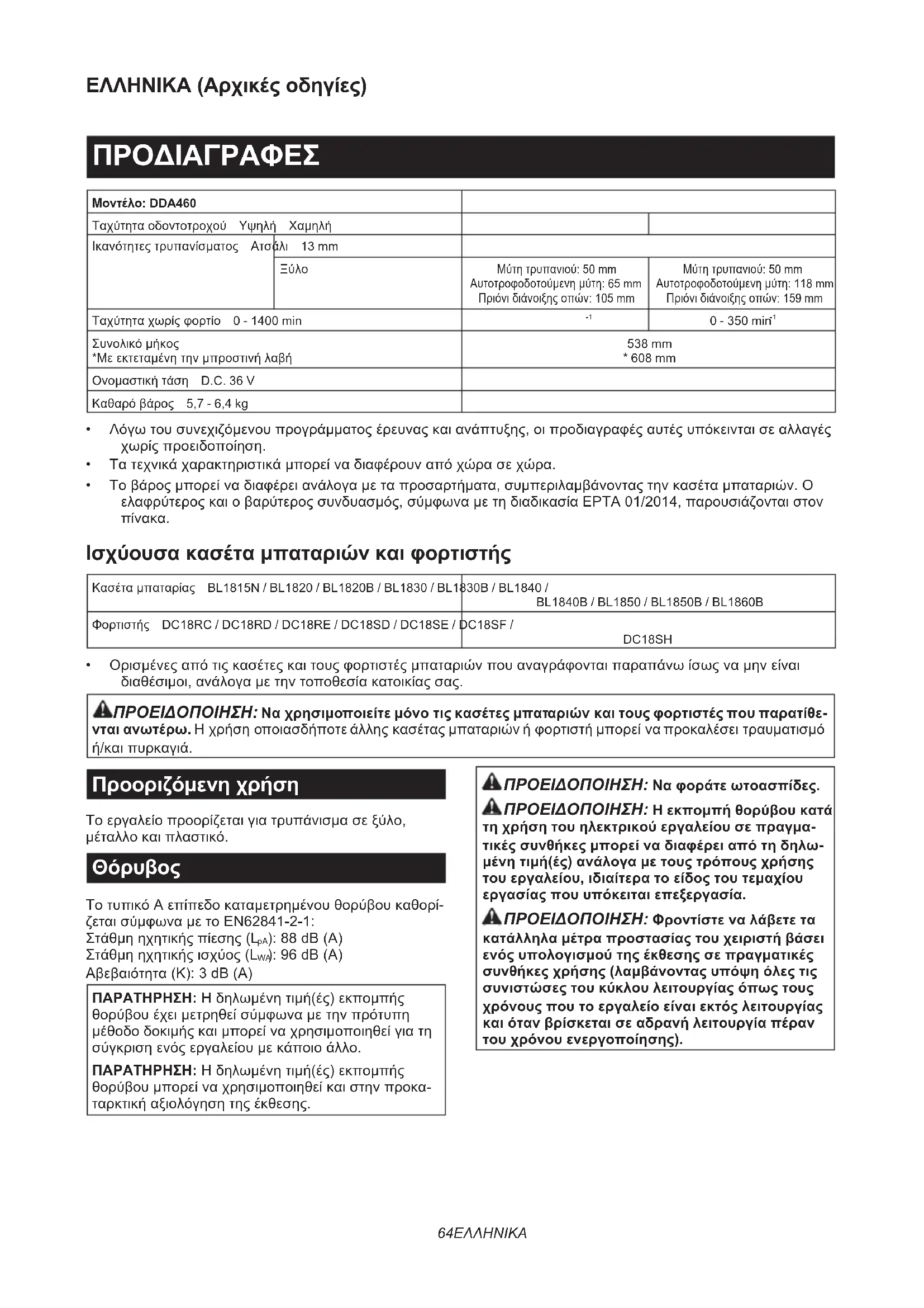 ):96dB(A) Αβεβαιότητα(Κ):3dB(A) ΠΑΡΑΤΗΡΗΣΗ:Ηδηλωμένητιμή(ές)εκπομπής θορύβουέχειμετρηθείσύμφωναμετηνπρότυπη μέθοδοδοκιμήςκαιμπορείναχρησιμοποιηθείγιατη σύγκρισηενόςεργαλείουμεκάποιοάλλο. ΠΑΡΑΤΗΡΗΣΗ:Ηδηλωμένητιμή(ές)εκπομπής θορύβουμπορείναχρησιμοποιηθείκαιστηνπροκα- ταρκτικήαξιολόγησητηςέκθεσης. ΠΡΟΕΙΔΟΠΟΙΗΣΗ: Να φοράτε ωτοασπίδες. ΠΡΟΕΙΔΟΠΟΙΗΣΗ: Η εκπομπή θορύβου κατά τη χρήση του ηλεκτρικού εργαλείου σε πραγμα- τικές συνθήκες μπορεί να διαφέρει από τη δηλω- μένη τιμή(ές) ανάλογα με τους τρόπους χρήσης του εργαλείου, ιδιαίτερα το είδος του τεμαχίου εργασίας που υπόκειται επεξεργασία. ΠΡΟΕΙΔΟΠΟΙΗΣΗ: Φροντίστε να λάβετε τα κατάλληλα μέτρα προστασίας του χειριστή βάσει ενός υπολογισμού της έκθεσης σε πραγματικές συνθήκες χρήσης (λαμβάνοντας υπόψη όλες τις συνιστώσες του κύκλου λειτουργίας όπως τους χρόνους που το εργαλείο είναι εκτός λειτουργίας και όταν βρίσκεται σε αδρανή λειτουργία πέραν του χρόνου ενεργοποίησης).65 ΕΛΛΗΝΙΚΑ