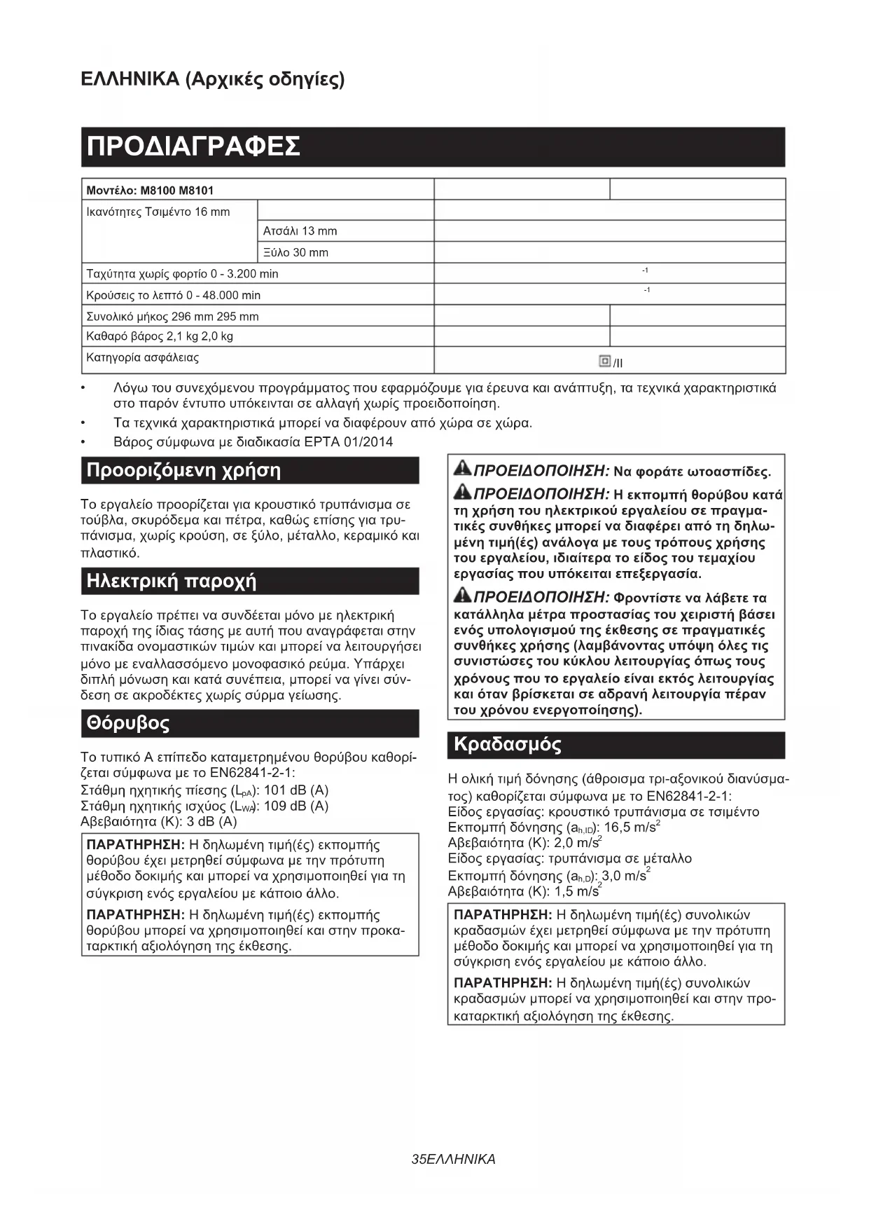 ): 109 dB (A) Αβεβαιότητα (Κ): 3 dB (A) ΠΑΡΑΤΗΡΗΣΗ: Η δηλωμένη τιμή(ές) εκπομπής θορύβου έχει μετρηθεί σύμφωνα με την πρότυπη μέθοδο δοκιμής και μπορεί να χρησιμοποιηθεί για τη σύγκριση ενός εργαλείου με κάποιο άλλο. ΠΑΡΑΤΗΡΗΣΗ: Η δηλωμένη τιμή(ές) εκπομπής θορύβου μπορεί να χρησιμοποιηθεί και στην προκα- ταρκτική αξιολόγηση της έκθεσης. ΠΡΟΕΙΔΟΠΟΙΗΣΗ: Να φοράτε ωτοασπίδες. ΠΡΟΕΙΔΟΠΟΙΗΣΗ: Η εκπομπή θορύβου κατά τη χρήση του ηλεκτρικού εργαλείου σε πραγμα- τικές συνθήκες μπορεί να διαφέρει από τη δηλω- μένη τιμή(ές) ανάλογα με τους τρόπους χρήσης του εργαλείου, ιδιαίτερα το είδος του τεμαχίου εργασίας που υπόκειται επεξεργασία. ΠΡΟΕΙΔΟΠΟΙΗΣΗ: Φροντίστε να λάβετε τα κατάλληλα μέτρα προστασίας του χειριστή βάσει ενός υπολογισμού της έκθεσης σε πραγματικές συνθήκες χρήσης (λαμβάνοντας υπόψη όλες τις συνιστώσες του κύκλου λειτουργίας όπως τους χρόνους που το εργαλείο είναι εκτός λειτουργίας και όταν βρίσκεται σε αδρανή λειτουργία πέραν του χρόνου ενεργοποίησης).