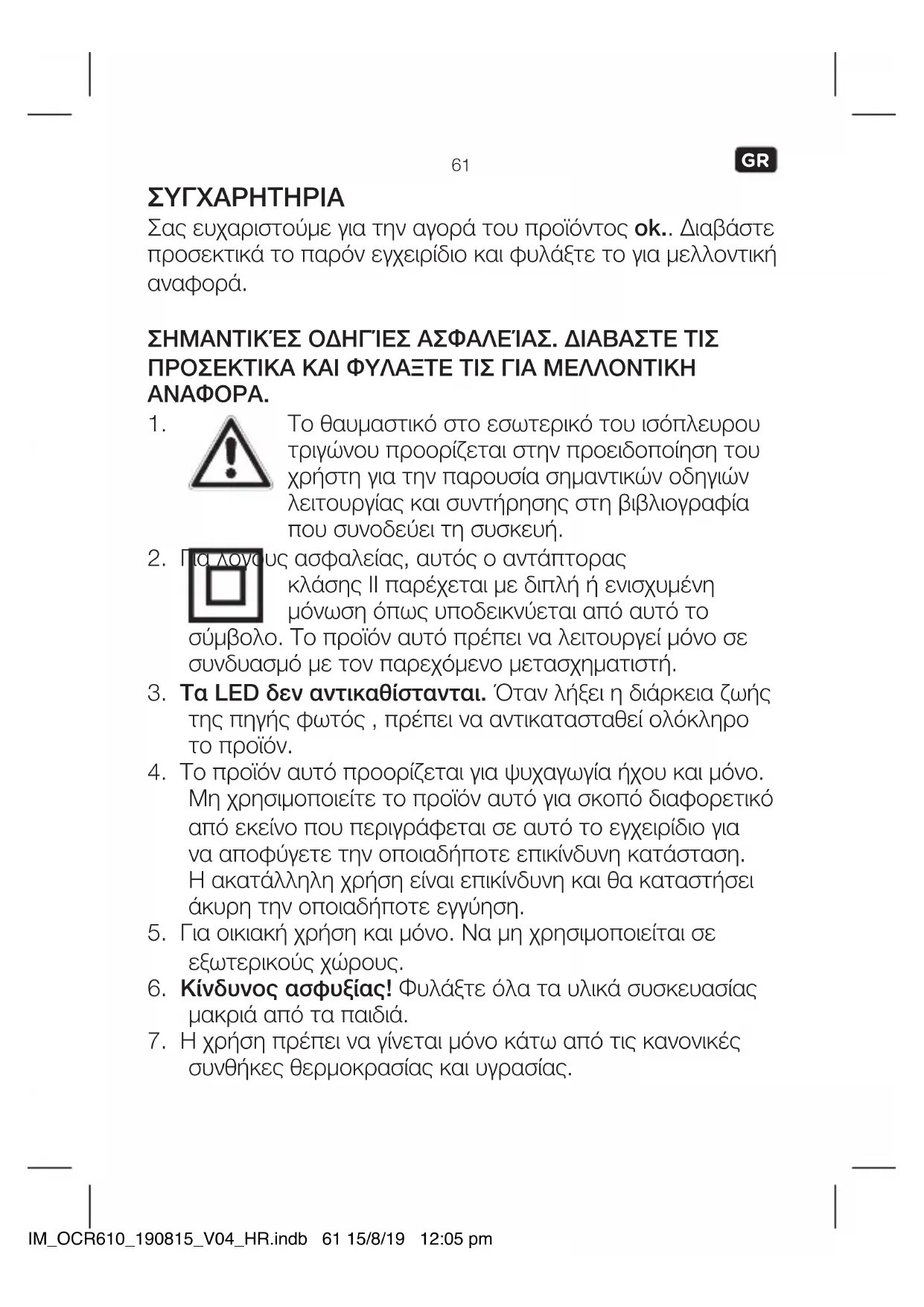 ΣΥΓΧΑΡΗΤΗΡΙΑ Σας ευχαριστούμε για την αγορά του προϊόντος ok.. Διαβάστε προσεκτικά το παρόν εγχειρίδιο και φυλάξτε το για μελλοντική