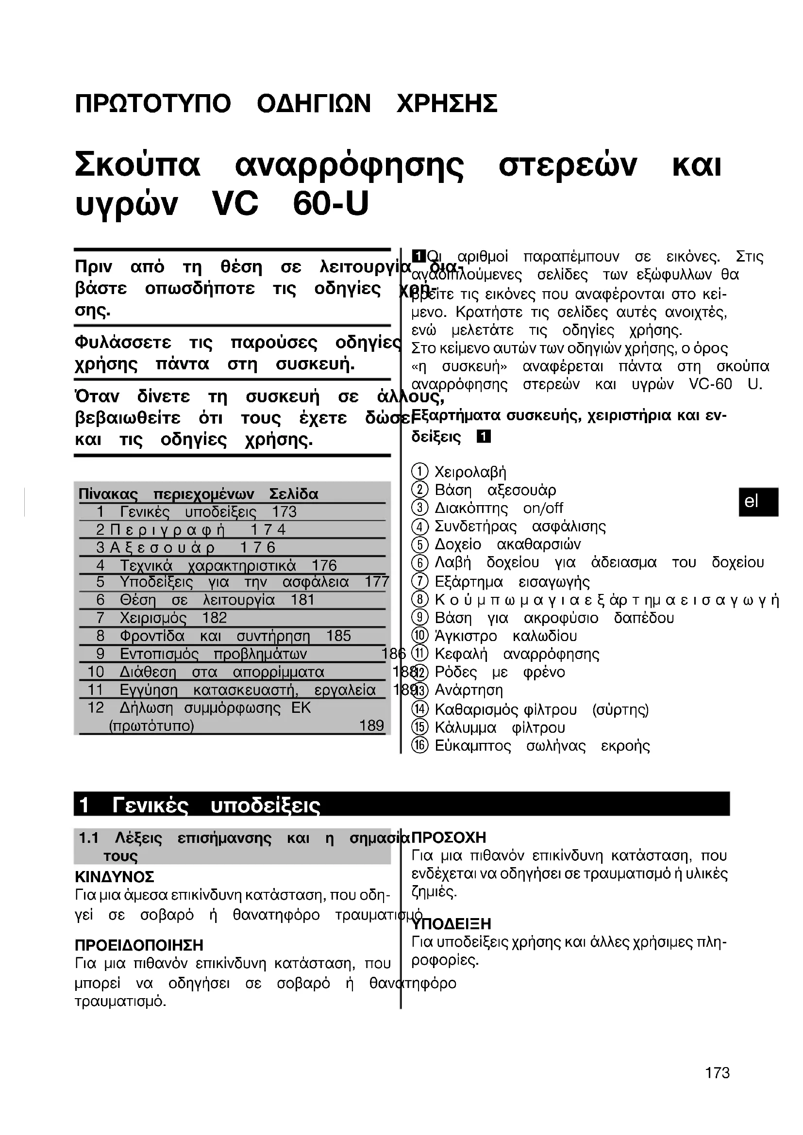 Printed: 05.12.2013 | Doc-Nr: PUB / 5071295 / 000 / 02ΠΡΩΤΟΤΥΠΟ ΟΔΗΓΙΩΝ ΧΡΗΣΗΣ Σκούπα αναρρόφησης στερεών και υγρών VC 60‑U Πριν από τη θέση σε λειτουργία δια-βάστε οπωσδήποτε τις οδηγίες χρή- Φυλάσσετε τις παρούσες οδηγίεςχρήσης πάντα στη συσκευή.Όταν δίνετε τη συσκευή σε άλλους,βεβαιωθείτε ότι τους έχετε δώσεικαι τις οδηγίες χρήσης.Πίνακας περιεχομένων Σελίδα1 Γενικές υποδείξεις 1732Περιγραφή 1743Αξεσουάρ 1764 Τεχνικά χαρακτηριστικά 1765 Υποδείξεις για την ασφάλεια 1776 Θέση σε λειτουργία 1817 Χειρισμός 1828 Φροντίδα και συντήρηση 1859 Εντοπισμός προβλημάτων 18610 Διάθεση στα απορρίμματα 18811 Εγγύηση κατασκευαστή, εργαλεία 18912 Δήλωση συμμόρφωσης ΕΚ(πρωτότυπο) 1891 Οι αριθμοί παραπέμπουν σε εικόνες. Στιςαναδιπλούμενες σελίδες των εξώφυλλων θα βρείτε τις εικόνες που αναφέρονται στο κεί- μενο. Κρατήστε τις σελίδες αυτές ανοιχτές, ενώ μελετάτε τις οδηγίες χρήσης. Στοκείμενοαυτώντωνοδηγιώνχρήσης,οόρος «η συσκευή» αναφέρεται πάντα στη σκούπααναρρόφησης στερεών και υγρών VC-60 U. Εξαρτήματα συσκευής, χειριστήρια και εν- δείξεις 1