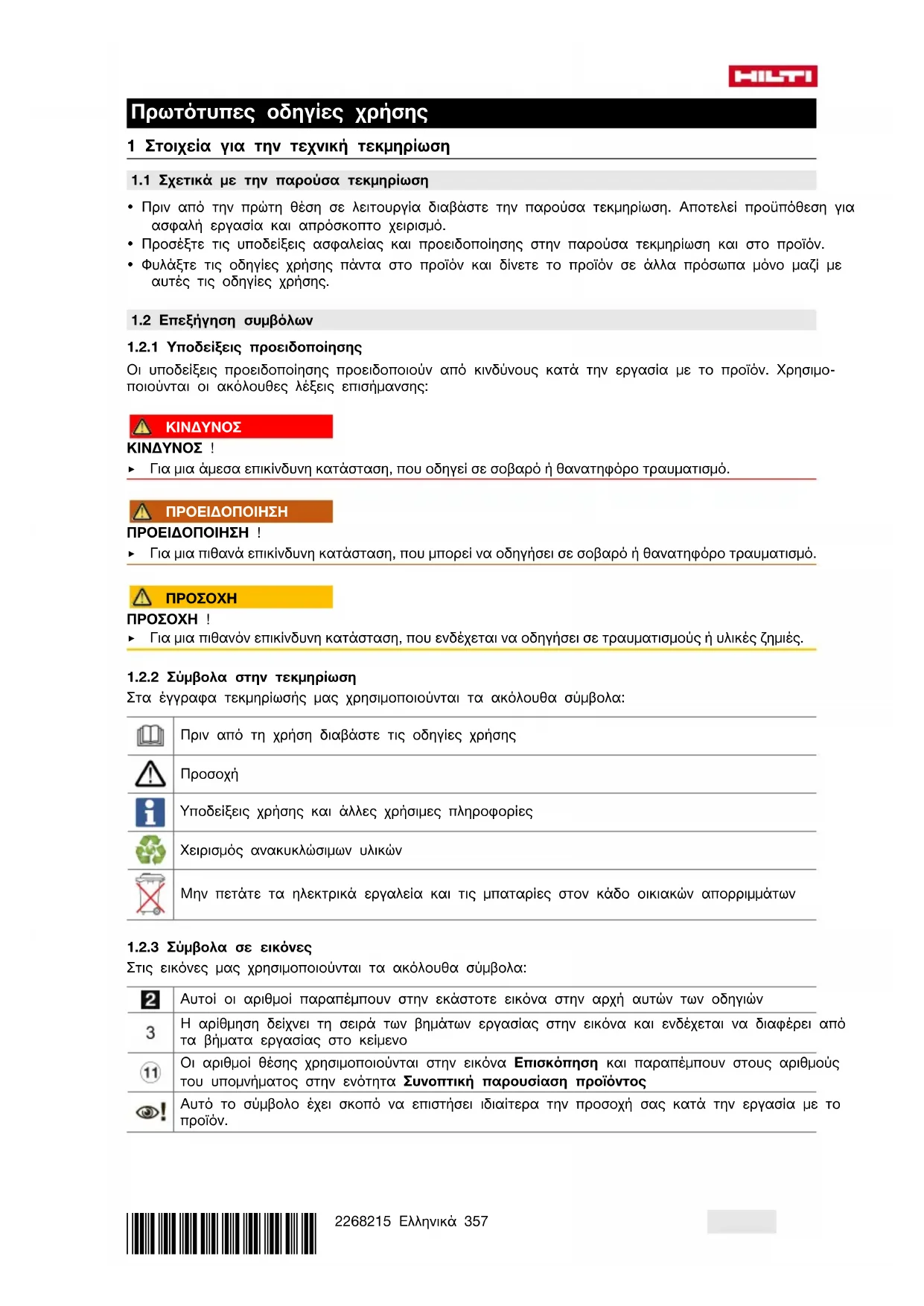 Δηλώνουμε ως μόνοι υπεύθυνοι, ότι το προϊόν που περιγράφεται εδώ συμφωνεί με τις ισχύουσες οδηγίες και τα ισχύοντα πρότυπα. Ένα αντίγραφο της δήλωσης συμμόρφωσης υπάρχει στο τέλος αυτής της τεκμηρίωσης. Τα έγγραφα τεχνικής τεκμηρίωσης υπάρχουν εδώ: Hilti Entwicklungsgesellschaft mbH | Zulassung Geräte | Hiltistraße 6 | 86916 Kaufering, DE 2 Ασφάλεια