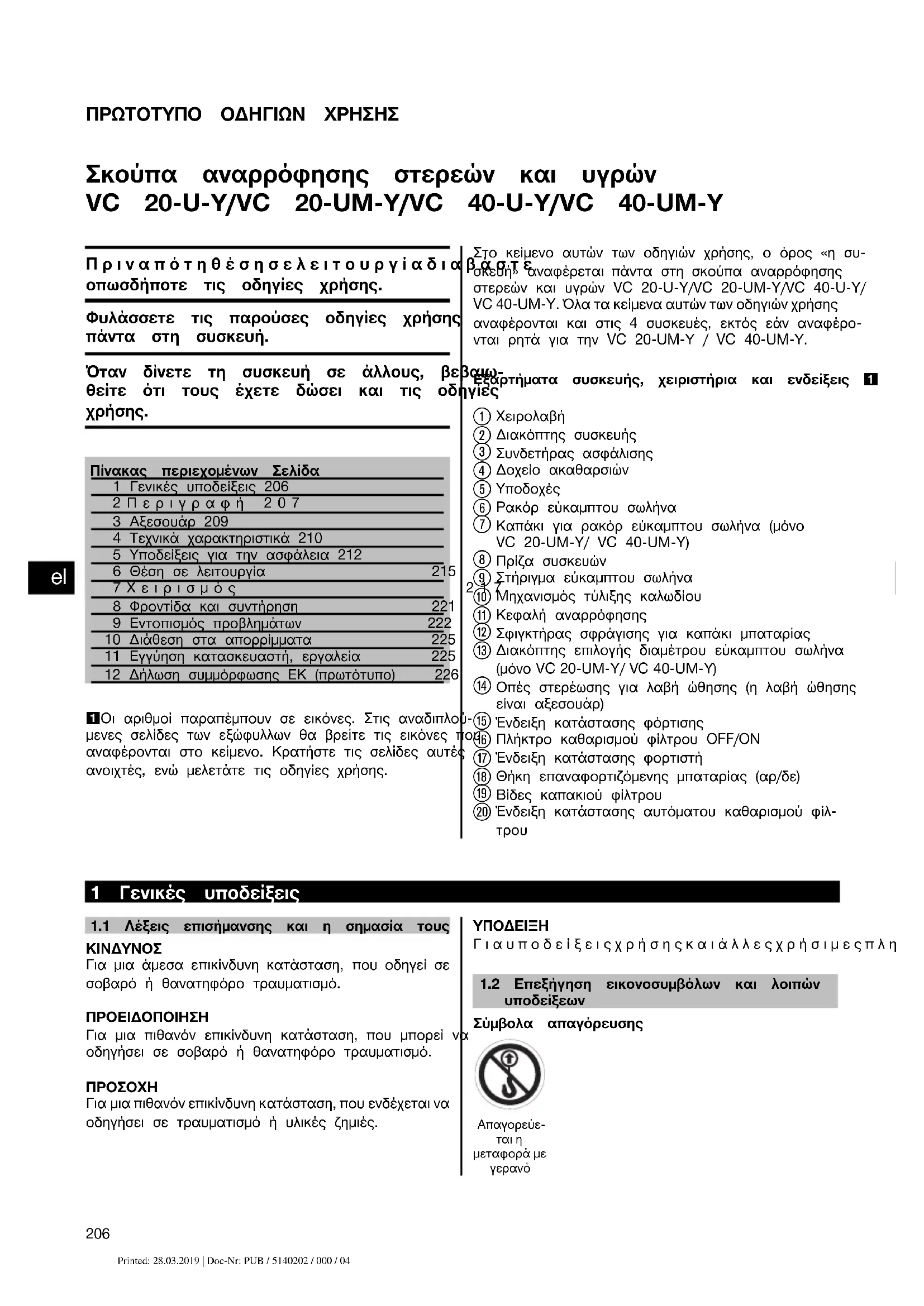 Πίνακας περιεχομένων Σελίδα1 Γενικές υποδείξεις 2062Περιγραφή 2073 Αξεσουάρ 2094 Τεχνικά χαρακτηριστικά 2105 Υποδείξεις για την ασφάλεια 2126 Θέση σε λειτουργία 2157Χειρισμός 2178 Φροντίδα και συντήρηση 2219 Εντοπισμός προβλημάτων 22210 Διάθεση στα απορρίμματα 22511 Εγγύηση κατασκευαστή, εργαλεία 22512 Δήλωση συμμόρφωσης ΕΚ (πρωτότυπο) 2261 Οι αριθμοί παραπέμπουν σε εικόνες. Στις αναδιπλού-μενες σελίδες των εξώφυλλων θα βρείτε τις εικόνες πουαναφέρονται στο κείμενο. Κρατήστε τις σελίδες αυτέςανοιχτές, ενώ μελετάτε τις οδηγίες χρήσης.Στο κείμενο αυτών των οδηγιών χρήσης, ο όρος «η συ-σκευή» αναφέρεται πάντα στη σκούπα αναρρόφησηςστερεών και υγρών VC 20‑U‑Y/VC 20‑UM‑Y/VC 40‑U‑Y/ VC40‑UM‑Y.Όλατακείμενααυτώντωνοδηγιώνχρήσης αναφέρονται και στις 4 συσκευές, εκτός εάν αναφέρο-νται ρητά για την VC 20‑UM-Υ / VC 40‑UM-Υ.Εξαρτήματα συσκευής, χειριστήρια και ενδείξεις 1