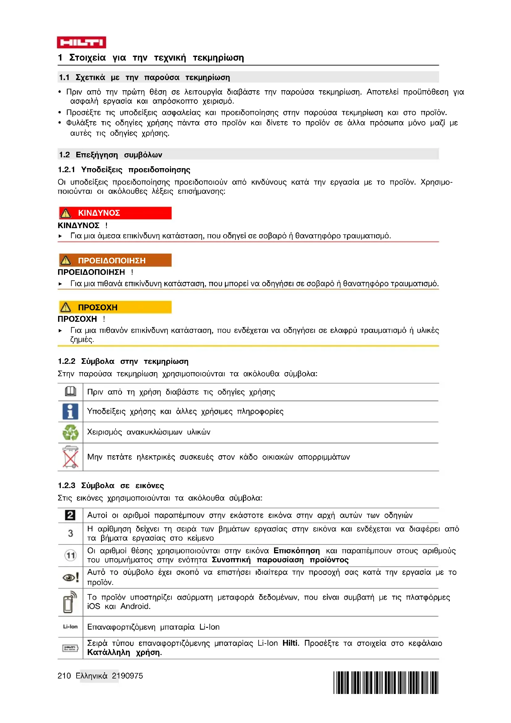 Δηλώνουμε ως μόνοι υπεύθυνοι, ότι το προϊόν που περιγράφεται εδώ συμφωνεί με τις ισχύουσες οδηγίες και τα ισχύονταπρότυπα. Ένα αντίγραφο της δήλωσηςσυμμόρφωσης υπάρχειστοτέλος αυτής της τεκμηρίωσης. Τα έγγραφα τεχνικής τεκμηρίωσης υπάρχουν εδώ: Hilti Entwicklungsgesellschaft mbH | Zulassung Geräte | Hiltistraße 6 | 86916 Kaufering, DE 2 Ασφάλεια