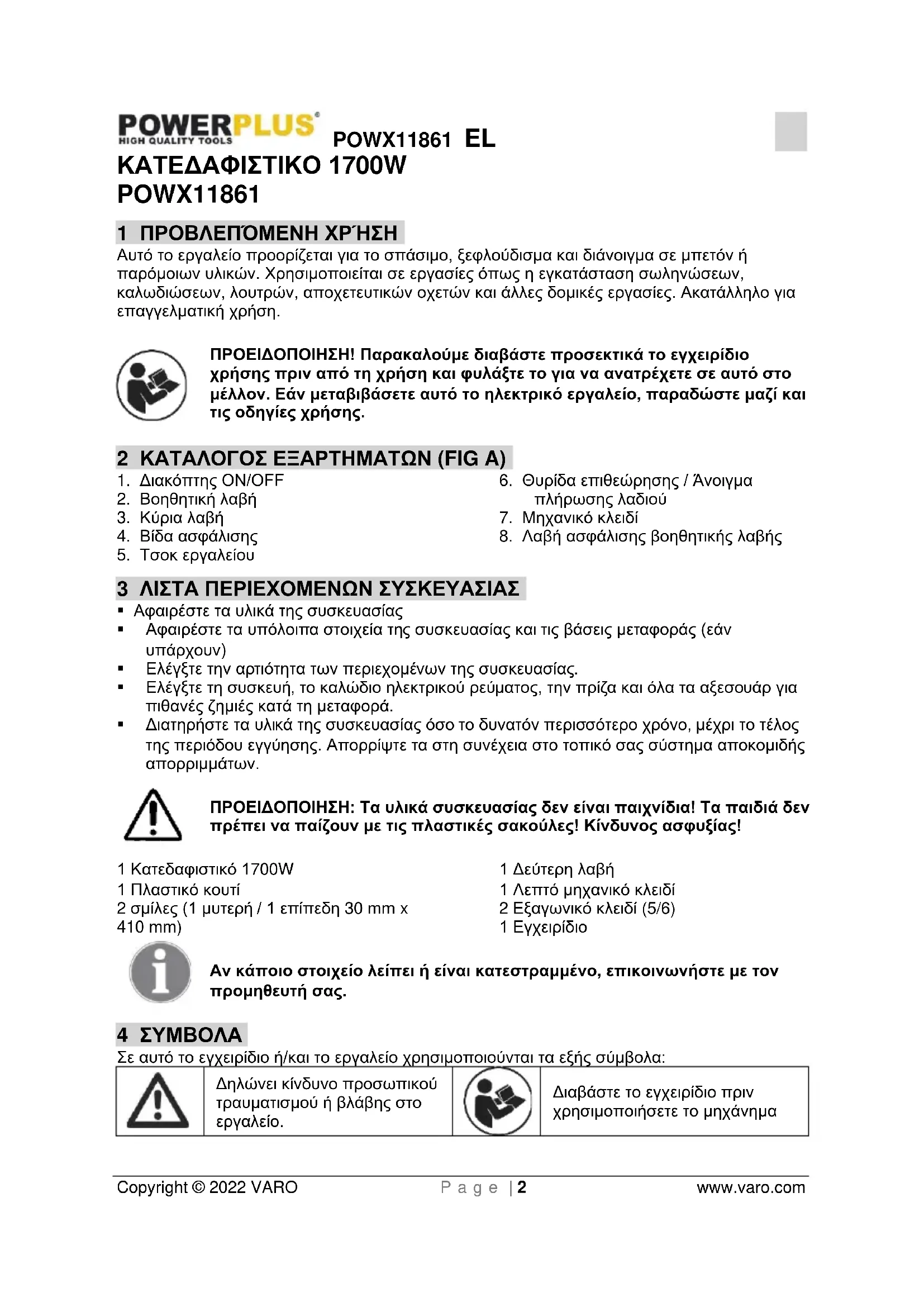 Διαβάστε το εγχειρίδιο πριν χρησιμοποιήσετε το μηχάνημαPOWX11861 EL Copyright © 2022 VARO P a g e | 3 www.varo.com