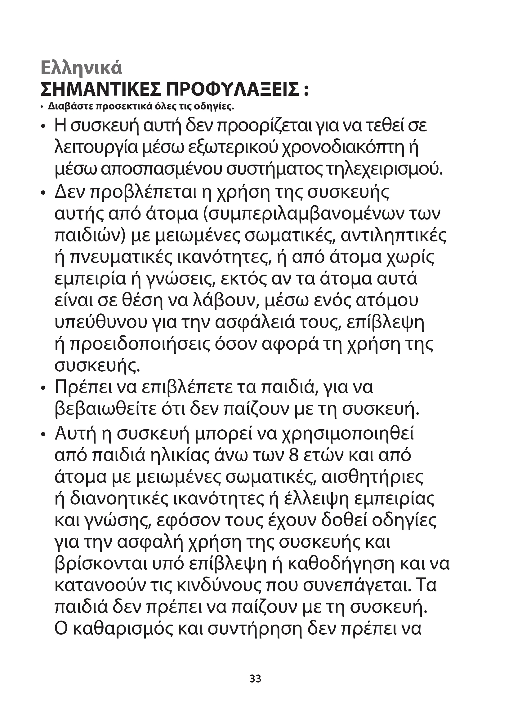 - Δεν προβλέπεται η χρήση της συσκευής αυτής από άτομα (συμπεριλαμβανομένων των παιδιών) με μειωμένες σωματικές, αντιληπτικές ή πνευματικές ικανότητες, ή από άτομα χωρίς εμπειρία ή γνώσεις, εκτός αν τα άτομα αυτά είναι σε θέση να λάβουν, μέσω ενός ατόμου υπεύθυνου για την ασφάλειά τους, επίβλεψη ή προειδοποιήσεις όσον αφορά τη χρήση της