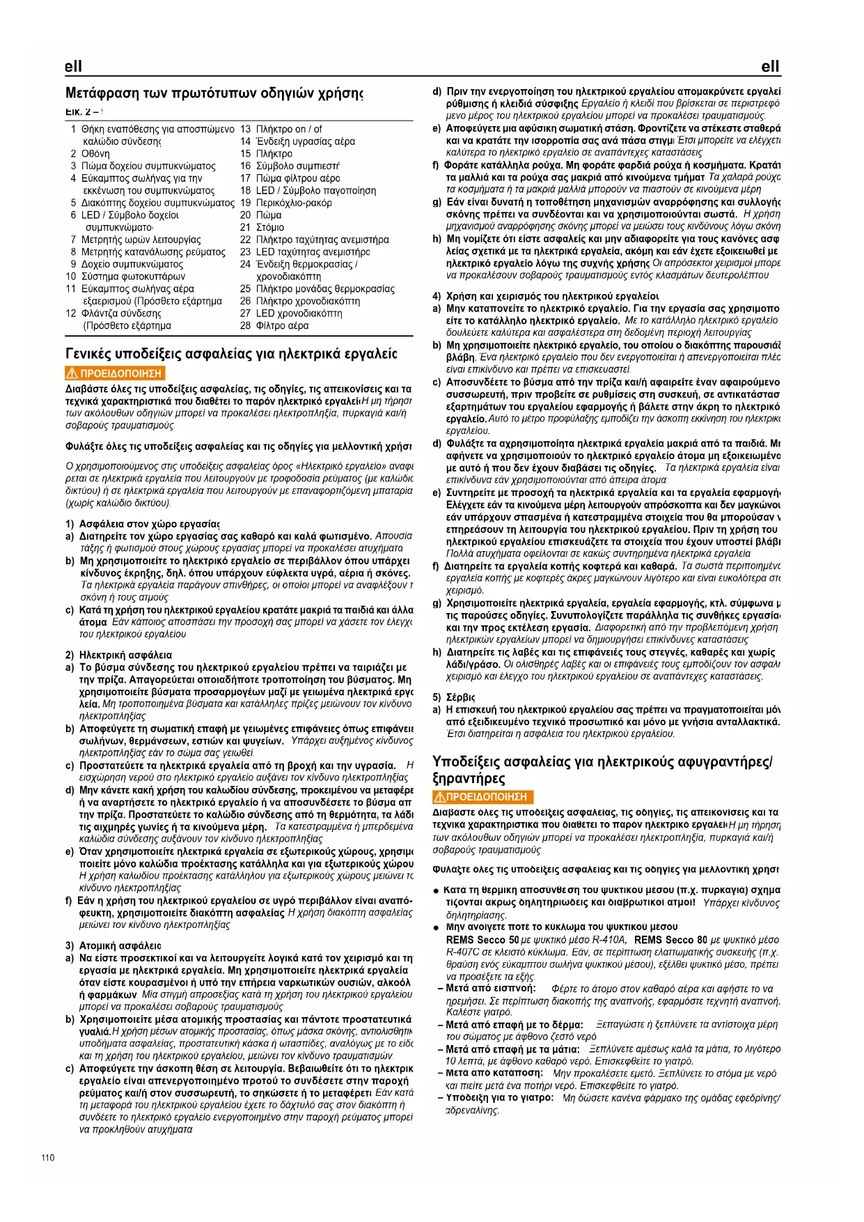 Проверить/отремонтировать устройство силами авторизованной сервисной мастерской REMS согласно договору. 109Μετάφραση των πρωτότυπων οδηγιών χρήσης Εικ. 2 – 9 1 Θήκη εναπόθεσης για αποσπώμενο καλώδιο σύνδεσης 2 Οθόνη 3 Πώμα δοχείου συμπυκνώματος 4 Εύκαμπτος σωλήνας για την εκκένωση του συμπυκνώματος 5 Διακόπτης δοχείου συμπυκνώματος 6 LED / Σύμβολο δοχείου συμπυκνώματος 7 Μετρητής ωρών λειτουργίας 8 Μετρητής κατανάλωσης ρεύματος 9 Δοχείο συμπυκνώματος 10 Σύστημα φωτοκυττάρων 11 Εύκαμπτος σωλήνας αέρα εξαερισμού (Πρόσθετο εξάρτημα) 12 Φλάντζα σύνδεσης (Πρόσθετο εξάρτημα) 13 Πλήκτρο on / off 14 Ένδειξη υγρασίας αέρα 15 Πλήκτρο 16 Σύμβολο συμπιεστή 17 Πώμα φίλτρου αέρα 18 LED / Σύμβολο παγοποίησης 19 Περικόχλιο-ρακόρ 20 Πώμα 21 Στόμιο 22 Πλήκτρο ταχύτητας ανεμιστήρα 23 LED ταχύτητας ανεμιστήρα 24 Ένδειξη θερμοκρασίας / χρονοδιακόπτη 25 Πλήκτρο μονάδας θερμοκρασίας 26 Πλήκτρο χρονοδιακόπτη 27 LED χρονοδιακόπτη 28 Φίλτρο αέρα Γενικές υποδείξεις ασφαλείας για ηλεκτρικά εργαλεία ΠΡΟΕΙΔΟΠΟΙΗΣΗ ΠΡΟΕΙΔΟΠΟΙΗΣΗ Διαβάστε όλες τις υποδείξεις ασφαλείας, τις οδηγίες, τις απεικονίσεις και τα τεχνικά χαρακτηριστικά που διαθέτει το παρόν ηλεκτρικό εργαλείο. Η μη τήρηση των ακόλουθων οδηγιών μπορεί να προκαλέσει ηλεκτροπληξία, πυρκαγιά και/ή σοβαρούς τραυματισμούς. Φυλάξτε όλες τις υποδείξεις ασφαλείας και τις οδηγίες για μελλοντική χρήση. Ο χρησιμοποιούμενος στις υποδείξεις ασφαλείας όρος «Ηλεκτρικό εργαλείο» αναφέ- ρεται σε ηλεκτρικά εργαλεία που λειτουργούν με τροφοδοσία ρεύματος (με καλώδιο δικτύου) ή σε ηλεκτρικά εργαλεία που λειτουργούν με επαναφορτιζόμενη μπαταρία (χωρίς καλώδιο δικτύου).