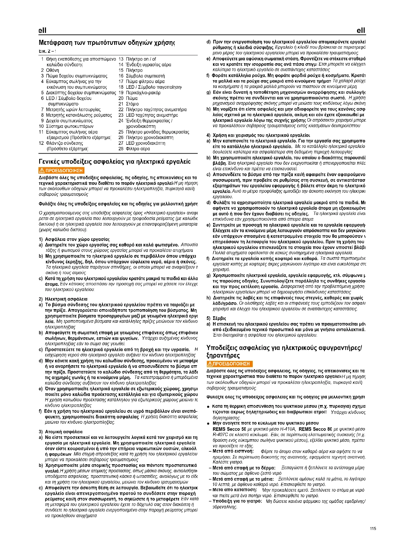 Μην ανοίγετε ποτέ το κύκλωμα του ψυκτικού μέσου. REMS Secco 50 με ψυκτικό μέσο R-410A, REMS Secco 80 με ψυκτικό μέσο R-407C σε κλειστό κύκλωμα. Εάν, σε περίπτωση ελαττωματικής συσκευής (π.χ. θραύση ενός εύκαμπτου σωλήνα ψυκτικού μέσου), εξέλθει ψυκτικό μέσο, πρέπει να προσέξετε τα εξής: – Μετά από εισπνοή: Φέρτε το άτομο στον καθαρό αέρα και αφήστε το να ηρεμήσει. Σε περίπτωση διακοπής της αναπνοής, εφαρμόστε τεχνητή αναπνοή. Καλέστε γιατρό. – Μετά από επαφή με το δέρμα: Ξεπαγώστε ή ξεπλύνετε τα αντίστοιχα μέρη του σώματος με άφθονο ζεστό νερό. – Μετά από επαφή με τα μάτια: Ξεπλύνετε αμέσως καλά τα μάτια, το λιγότερο 10 λεπτά, με άφθονο καθαρό νερό. Επισκεφθείτε το γιατρό. – Μετά από κατάποση: Μην προκαλέσετε εμετό. Ξεπλύνετε το στόμα με νερό και πιείτε μετά ένα ποτήρι νερό. Επισκεφθείτε το γιατρό. – Υπόδειξη για το γιατρό: Μη δώσετε κανένα φάρμακο της ομάδας εφεδρίνης/ αδρεναλίνης. ell ell 115ell ell REMS Secco 50