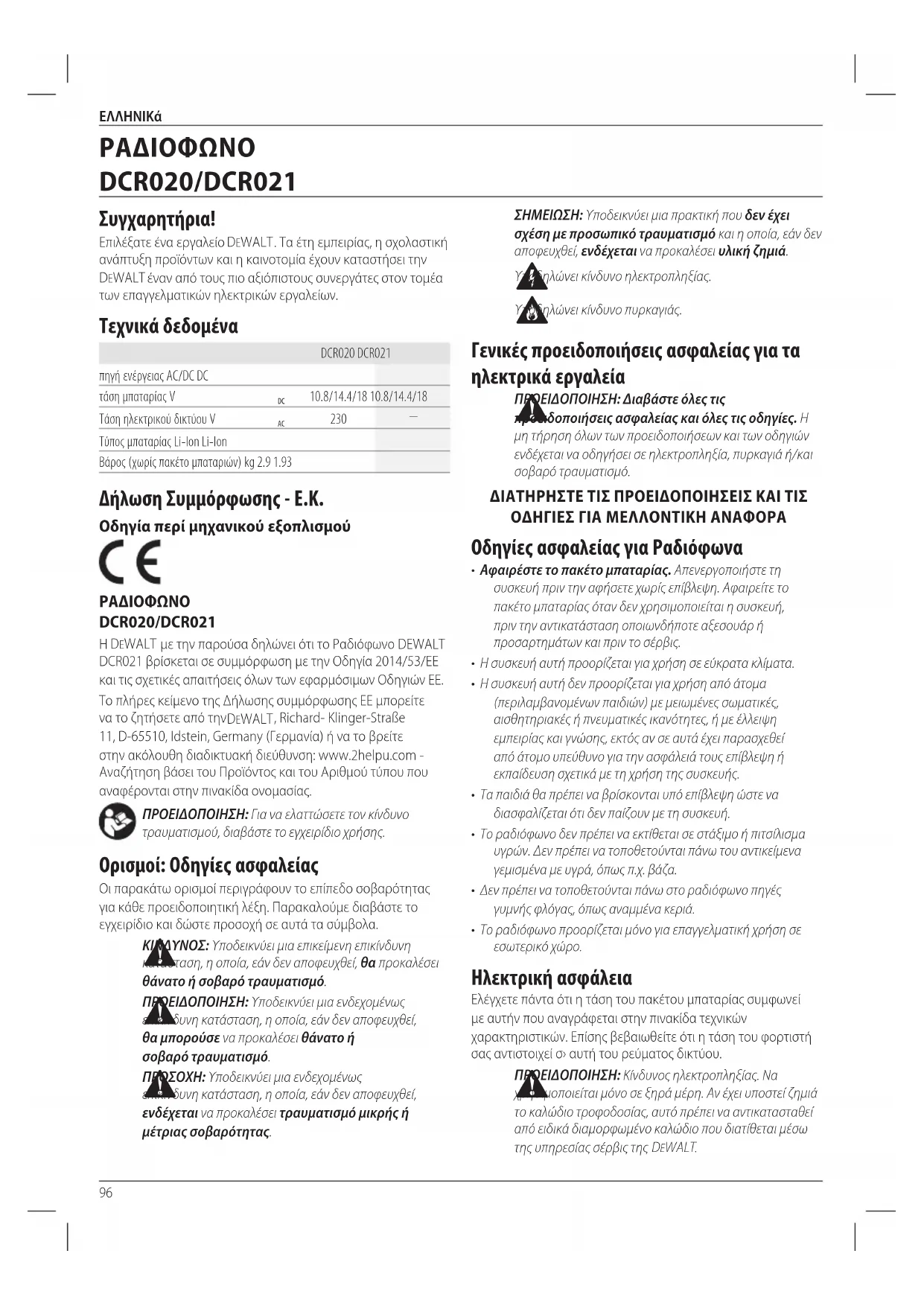 DeWALT με την παρούσα δηλώνει ότι το Ραδιόφωνο DEWALT DCR021 βρίσκεται σε συμμόρφωση με την Οδηγία 2014/53/ΕΕ και τις σχετικές απαιτήσεις όλων των εφαρμόσιμων Οδηγιών ΕΕ. Το πλήρες κείμενο της Δήλωσης συμμόρφωσης ΕΕ μπορείτε να το ζητήσετε από την DeWALT , Richard- Klinger-Straße 11, D-65510, Idstein, Germany (Γερμανία) ή να το βρείτε στην ακόλουθη διαδικτυακή διεύθυνση: www.2helpu.com - Αναζήτηση βάσει του Προϊόντος και του Αριθμού τύπου που αναφέρονται στην πινακίδα ονομασίας. ΠΡΟΕΙΔΟΠΟΙΗΣΗ: Για να ελαττώσετε τον κίνδυνο τραυματισμού, διαβάστε το εγχειρίδιοχρήσης. Ορισμοί: Οδηγίες ασφαλείας Οι παρακάτω ορισμοί περιγράφουν το επίπεδο σοβαρότητας για κάθε προειδοποιητική λέξη. Παρακαλούμε διαβάστε το εγχειρίδιο και δώστε προσοχή σε αυτά τασύμβολα.