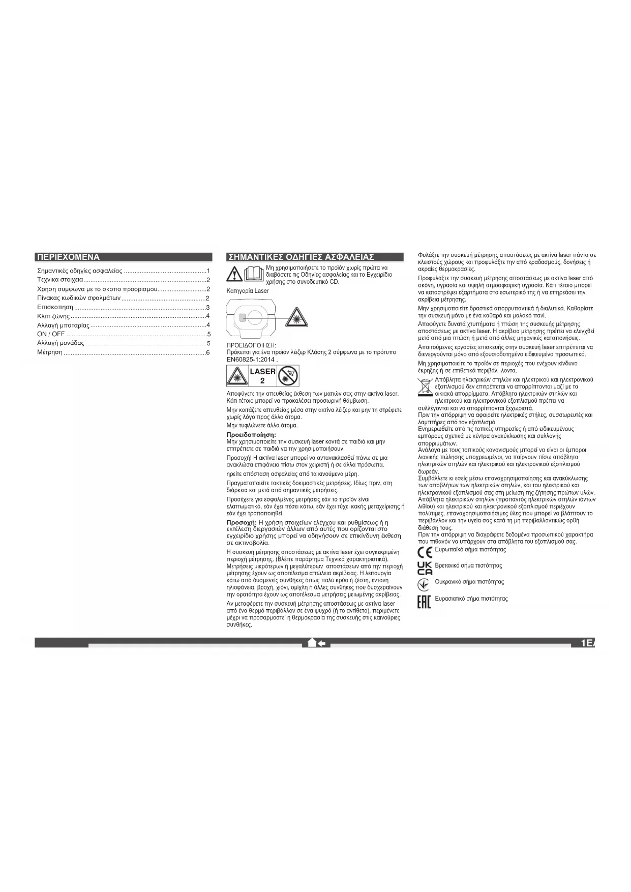 Συμβάλλετε κι εσείς μέσω επαναχρησιμοποίησης και ανακύκλωσης των αποβλήτων των ηλεκτρικών στηλών, και του ηλεκτρικού και ηλεκτρονικού εξοπλισμού σας στη μείωση της ζήτησης πρώτων υλών. Απόβλητα ηλεκτρικών στηλών (προπαντός ηλεκτρικών στηλών ιόντων λιθίου) και ηλεκτρικού και ηλεκτρονικού εξοπλισμού περιέχουν πολύτιμες, επαναχρησιμοποιήσιμες ύλες που μπορεί να βλάπτουν το περιβάλλον και την υγεία σας κατά τη μη περιβαλλοντικώς ορθή διάθεσή τους. Πριν την απόρριψη να διαγράφετε δεδομένα προσωπικού χαρακτήρα που πιθανόν να υπάρχουν στα απόβλητα του εξοπλισμού σας. Ευρωπαϊκό σήμα πιστότητας Βρετανικό σήμα πιστότητας Ουκρανικό σήμα πιστότητας Ευρασιατικό σήμα πιστότητας ΠΈΡΙΈΧΟΜΈΝΑ Σημαντικές οδηγίες ασφαλείας ...............................................1 Τεχνικα στοιχεια