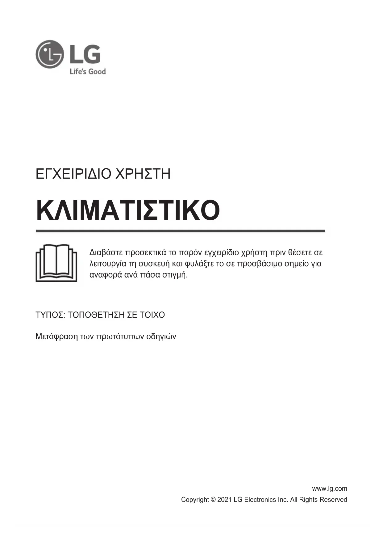 - Certaines fonctions peuvent ne pas être prises en charge en fonction du modèle.www.lg.com ΚΛΙΜΑΤΙΣΤΙΚΟ Copyright © 2021 LG Electronics Inc. All Rights Reserved ΤΥΠΟΣ: ΤΟΠΟΘΕΤΗΣΗ ΣΕ ΤΟΙΧΟ Μετάφραση των πρωτότυπων οδηγιών ΕΓΧΕΙΡΙΔΙΟ ΧΡΗΣΤΗ Διαβάστε προσεκτικά το παρόν εγχειρίδιο χρήστη πριν θέσετε σε λειτουργία τη συσκευή και φυλάξτε το σε προσβάσιμο σημείο για αναφορά ανά πάσα στιγμή.ΠΙΝΑΚΑΣ ΠΕΡΙΕΧΟΜΕΝΩΝ Το εγχειρίδιο αυτό μπορεί να περιέχει εικόνες ή περιεχόμενο διαφορετικό από το μοντέλο που αγοράσατε. Το εγχειρίδιο υπόκειται σε αναθεώρηση από τον κατασκευαστή. ΟΔΗΓΙΕΣ ΑΣΦΑΛΕΙΑΣ ...................................................................3 ΣΗΜΑΝΤΙΚΕΣ ΟΔΗΓΙΕΣ ΑΣΦΑΛΕΙΑΣ ..............................................................4 ΛΕΙΤΟΥΡΓΙΑ .................................................................................12 Σημειώσεις για λειτουργία ...............................................................................12 Εξαρτήματα και λειτουργίες .............................................................................12 Ασύρματο Τηλεχειριστήριο ..............................................................................13 Αυτόματη επανεκκίνηση του Κλιματιστικού .....................................................18 Χρήση του Τρόπου λειτουργίας .......................................................................18 Χρήση του Τρόπου λειτουργίας Πίδακα ..........................................................21 Χρήση της Λειτουργίας Ταχύτητας Ανεμιστήρα ...............................................22 Χρήση της Λειτουργίας Κατεύθυνσης Ροής Αέρα ............................................22 Ρύθμιση του Χρονοδιακόπτη Ενεργοποίησης/Απενεργοποίησης ...................23 Χρήση της Λειτουργίας Ύπνου (Προαιρετικό) .................................................24 Χρήση της Λειτουργίας Απλού Χρονοδιακόπτη (Προαιρετικό) ........................24 Χρήση της Λειτουργίας Προβολής Ενέργειας (Προαιρετικό) ...........................25 Χρήση της Λειτουργίας Σβήσιμου Φωτός (Προαιρετικό) .................................25 Χρήση της Λειτουργίας Αέρα Άνεσης (Προαιρετικό) ........................................25 Χρήση της Λειτουργίας Ελέγχου Ενέργειας (Προαιρετικό) ..............................26 Χρήση της λειτουργίας UVnano (Προαιρετικό) ................................................ 26 Τρόπος χρήσης Καθαρισμού Αέρα .................................................................27 Έλεγχος συνολικής ποιότητας αέρα ................................................................27 Χρήση ειδικών λειτουργιών .............................................................................29 ΕΞΥΠΝΕΣ ΛΕΙΤΟΥΡΓΙΕΣ ..............................................................31 Εφαρμογή LG ThinQ .......................................................................................31 Smart Diagnosis .............................................................................................. 33 ΣΥΝΤΗΡΗΣΗ ................................................................................. 34 Αντικατάσταση και καθαρισμός του φίλτρου Micro Dust .................................36 Αντικατάσταση του Τριπλού φίλτρου (Προαιρετικό) ........................................37 Καθαρίστε τον αισθητήρα PM1,0 ....................................................................38 ΕΠΙΛΥΣΗ ΠΡΟΒΛΗΜΑΤΩΝ ..........................................................393