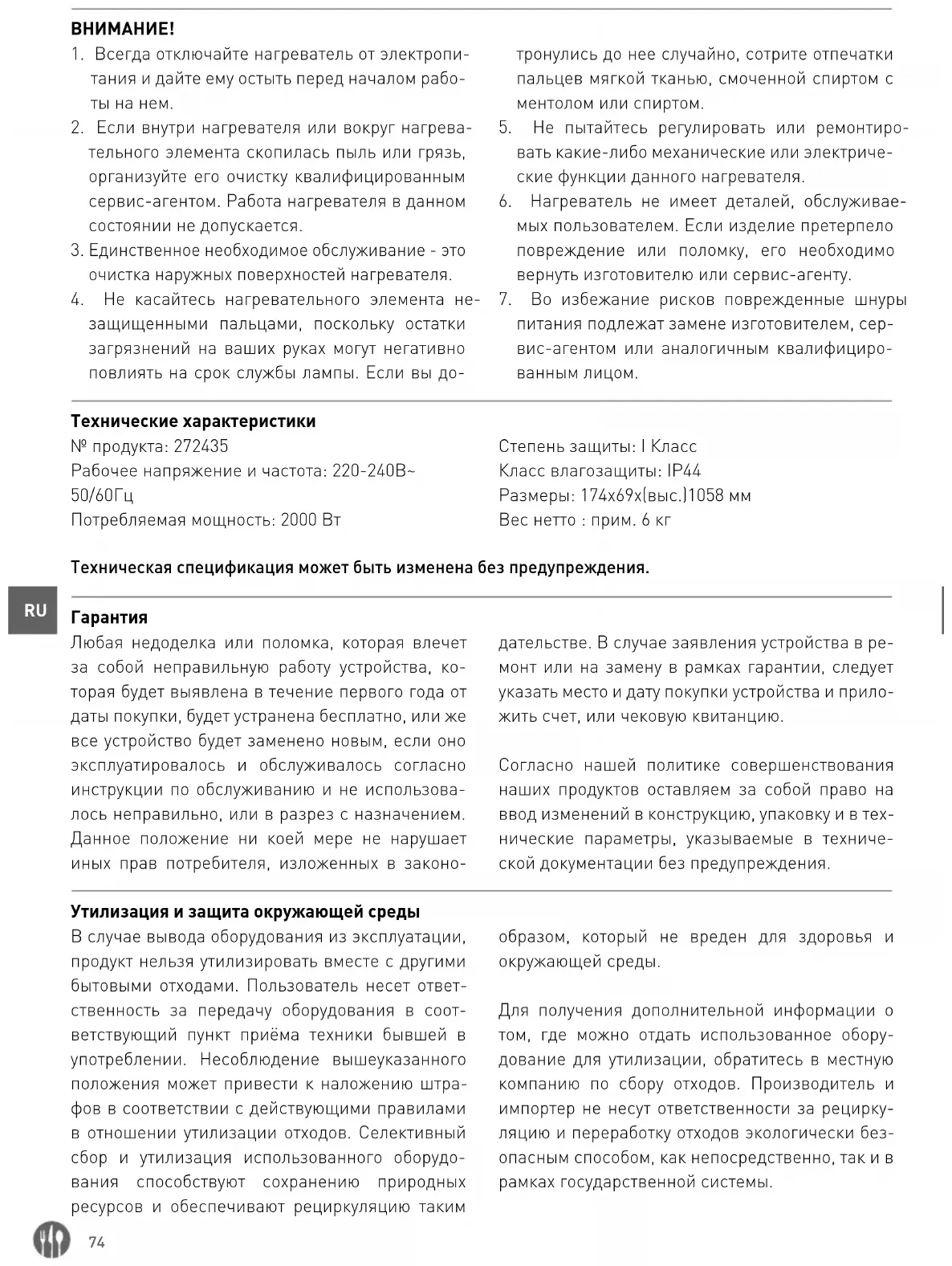 να αντικατασταθούν από τον κατασκευαστή, τον αντιπρόσωπο σέρβις ή παρόμοιο εξουσιοδοτημέ- νο άτομο για την αποφυγή κινδύνου. Τεχνικές προδιαγραφές Αρ. είδους.: 272435 Τάση και συχνότητα λειτουργίας: 220-240V~ 50/60Hz Ονομαστική ισχύς εισόδου: 2000 W Κατηγορία προστασίας: Κατηγορία I Κλάση προστασίας νερού: IP44 Διαστάσεις: 174x69x(Y)1058 mm Καθαρό βάρος: περίπου 6 kg Οι τεχνικές προδιαγραφές μπορούν να τροποποιηθούν χωρίς προηγούμενη ειδοποίηση.