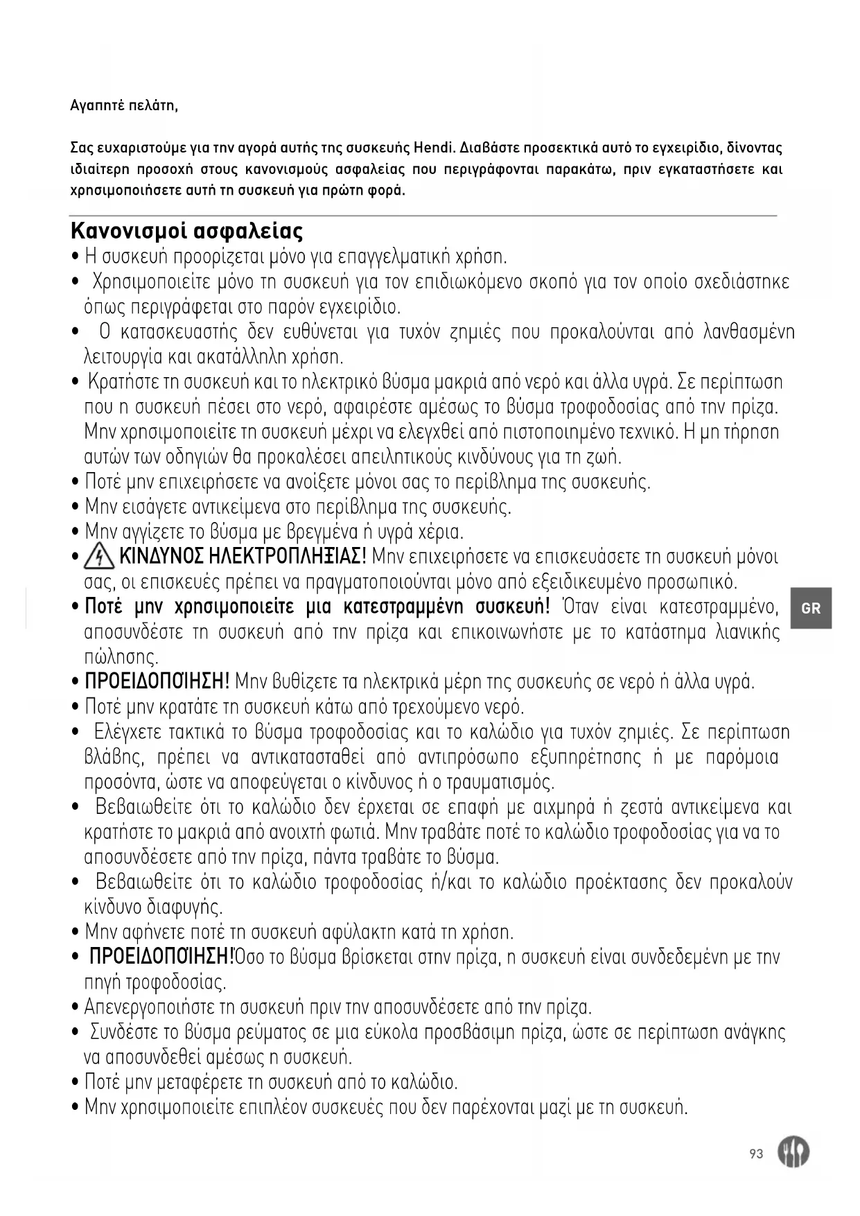 Αγαπητέ πελάτη, Σας ευχαριστούμε για την αγορά αυτής της συσκευής Hendi. Διαβάστε προσεκτικά αυτό το εγχειρίδιο, δίνοντας ιδιαίτερη προσοχή στους κανονισμούς ασφαλείας που περιγράφονται παρακάτω, πριν εγκαταστήσετε και χρησιμοποιήσετε αυτή τη συσκευή για πρώτη φορά. Κανονισμοί ασφαλείας