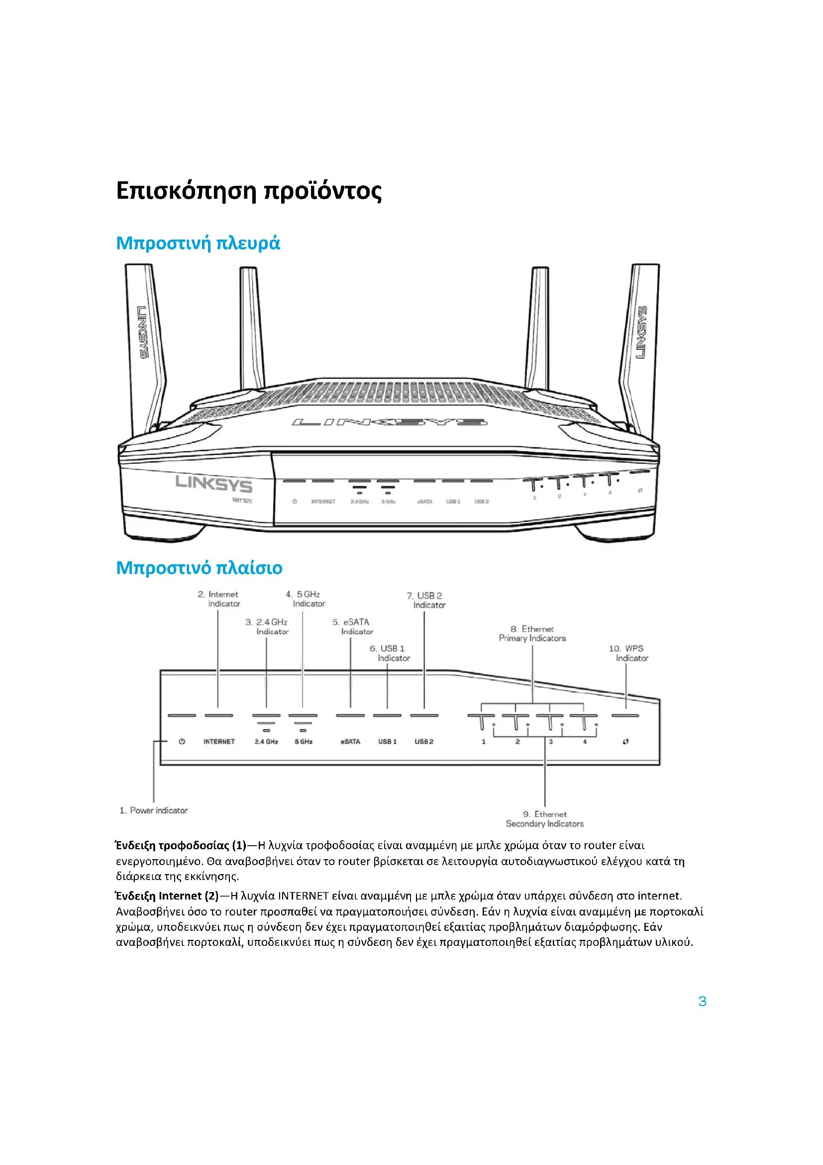 - Χαρακτηριστικά περιβάλλοντος λειτουργίας Επισκόπηση προϊόντος Μπροστινή πλευρά Μπροστινό πλαίσιο Ένδειξη τροφοδοσίας (1)—Η λυχνία τροφοδοσίας είναι αναμμένη με μπλε χρώμα όταν το router είναι ενεργοποιημένο. Θα αναβοσβήνει όταν το router βρίσκεται σε λειτουργία αυτοδιαγνωστικού ελέγχου κατά τη διάρκεια της εκκίνησης. Ένδειξη Internet (2)—Η λυχνία INTERNET είναι αναμμένη με μπλε χρώμα όταν υπάρχει σύνδεση στο internet. Αναβοσβήνει όσο το router προσπαθεί να πραγματοποιήσει σύνδεση. Εάν η λυχνία είναι αναμμένη με πορτοκαλί χρώμα, υποδεικνύει πως η σύνδεση δεν έχει πραγματοποιηθεί εξαιτίας προβλημάτων διαμόρφωσης. Εάν αναβοσβήνει πορτοκαλί, υποδεικνύει πως η σύνδεση δεν έχει πραγματοποιηθεί εξαιτίας προβλημάτων υλικού.4 Ένδειξη 2.4 GHz (3) — Η λυχνία είναι αναμμένη με μπλε χρώμα όταν ένας ή περισσότεροι πελάτες είναι συνδεδεμένοι στο δίκτυο 2.4 GHz. Η λυχνία αναβοσβήνει όταν το router πραγματοποιεί αποστολή ή λήψη δεδομένων μέσω του δικτύου 2.4 GHz. Ένδειξη 5 GHz (4) — Η λυχνία είναι αναμμένη με μπλε χρώμα όταν ένας ή περισσότεροι πελάτες είναι συνδεδεμένοι στο δίκτυο 5GHz. Η λυχνία αναβοσβήνει όταν το router πραγματοποιεί αποστολή ή λήψη δεδομένων μέσω του δικτύου 5 GHz. p. 203