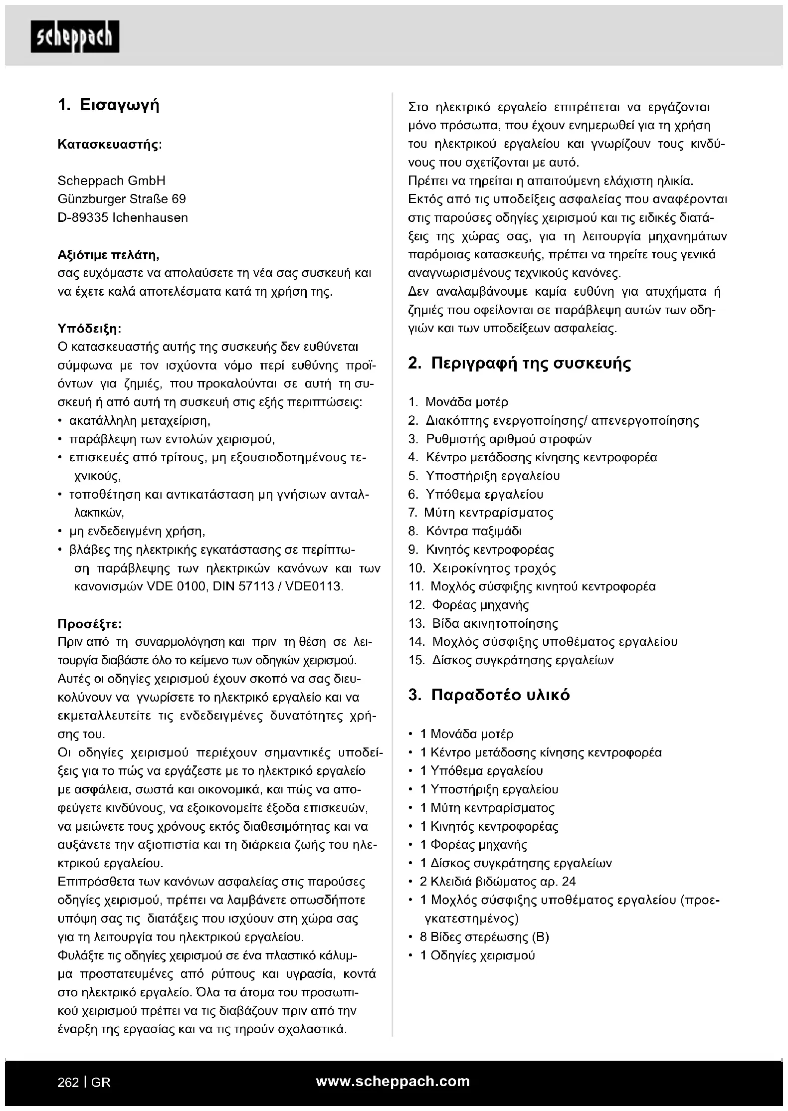 Κατασκευαστής: Scheppach GmbH Günzburger Straße 69 D-89335 Ichenhausen Αξιότιμε πελάτη, σας ευχόμαστε να απολαύσετε τη νέα σας συσκευή και να έχετε καλά αποτελέσματα κατά τη χρήση της.