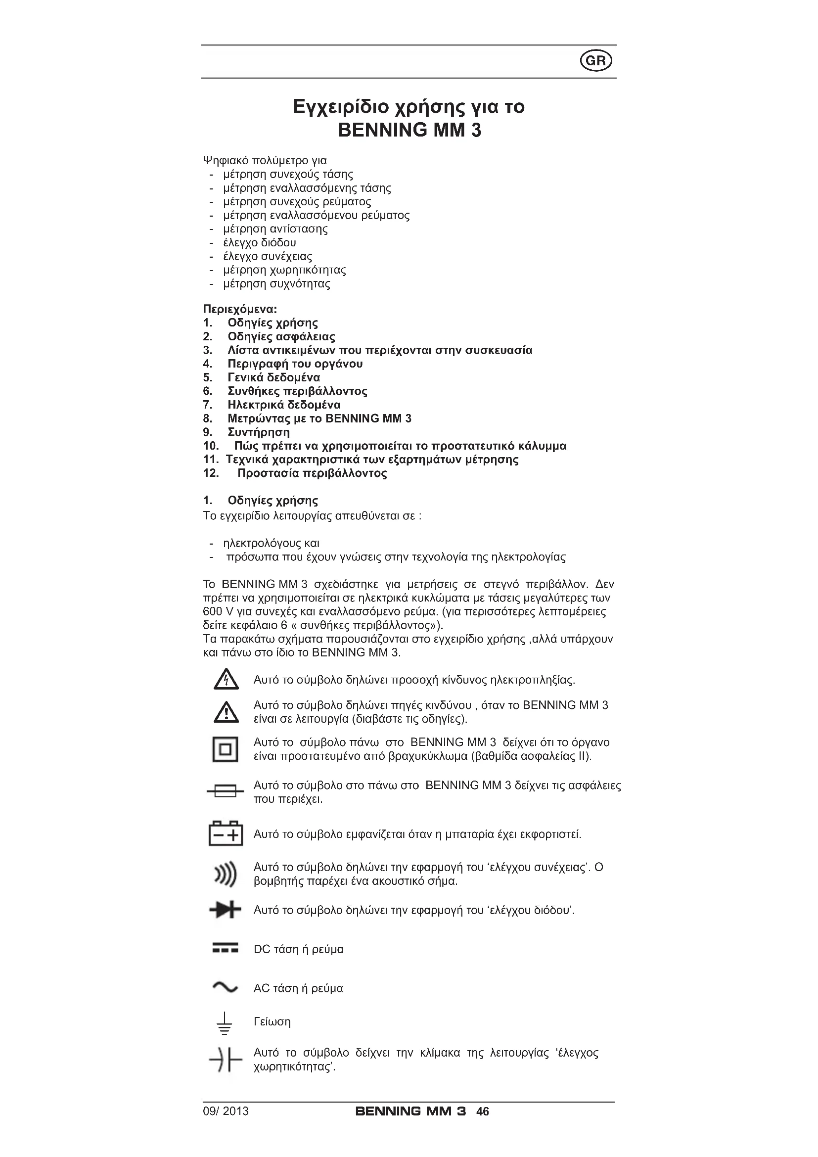 Εγχειρίδιοχρήσηςγιατο BENNING MM 3 Ψηφιακό πολύμετρο για - μέτρηση συνεχούς τάσης - μέτρηση εναλλασσόμενης τάσης - μέτρηση συνεχούς ρεύματος - μέτρηση εναλλασσόμενου ρεύματος - μέτρηση αντίστασης - έλεγχο διόδου - έλεγχο συνέχειας - μέτρηση χωρητικότητας - μέτρηση συχνότητας Περιεχόμενα: