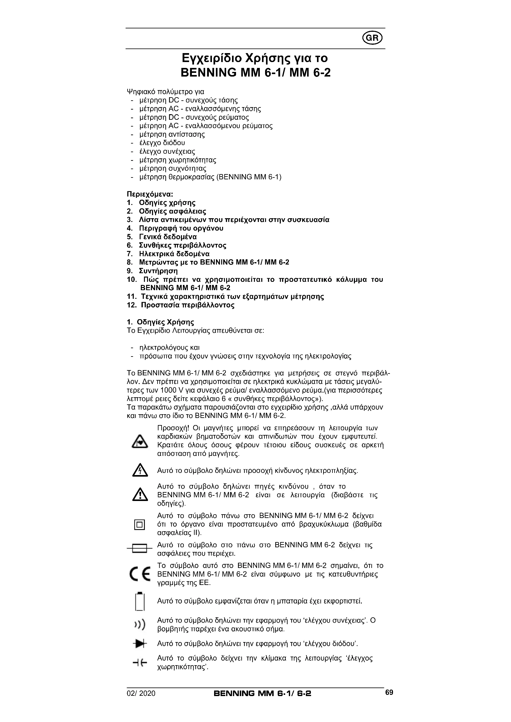 Αυτό το σύμβολο πάνω στο BENNING MM 6-1/ MM 6-2 δείχνει ότι το όργανο είναι προστατευμένο από βραχυκύκλωμα (βαθμίδα ασφαλείας ΙΙ). Αυτό το σύμβολο στο πάνω στο BENNING MM 6-2 δείχνει τις ασφάλειες που περιέχει. Το σύμβολο αυτό στο BENNING MM 6-1/ MM 6-2 σημαίνει, ότι το BENNING MM 6-1/ MM 6-2 είναι σύμφωνο με τις κατευθυντήριες γραμμές της ΕΕ. Αυτό το σύμβολο εμφανίζεται όταν η μπαταρία έχει εκφορτιστεί. Αυτό το σύμβολο δηλώνει την εφαρμογή του ‘ελέγχου συνέχειας’. Ο βομβητής παρέχει ένα ακουστικό σήμα. Αυτό το σύμβολο δηλώνει την εφαρμογή του ‘ελέγχου διόδου’. Αυτό το σύμβολο δείχνει την κλίμακα της λειτουργίας ‘έλεγχος χωρητικότητας’.02/ 2020