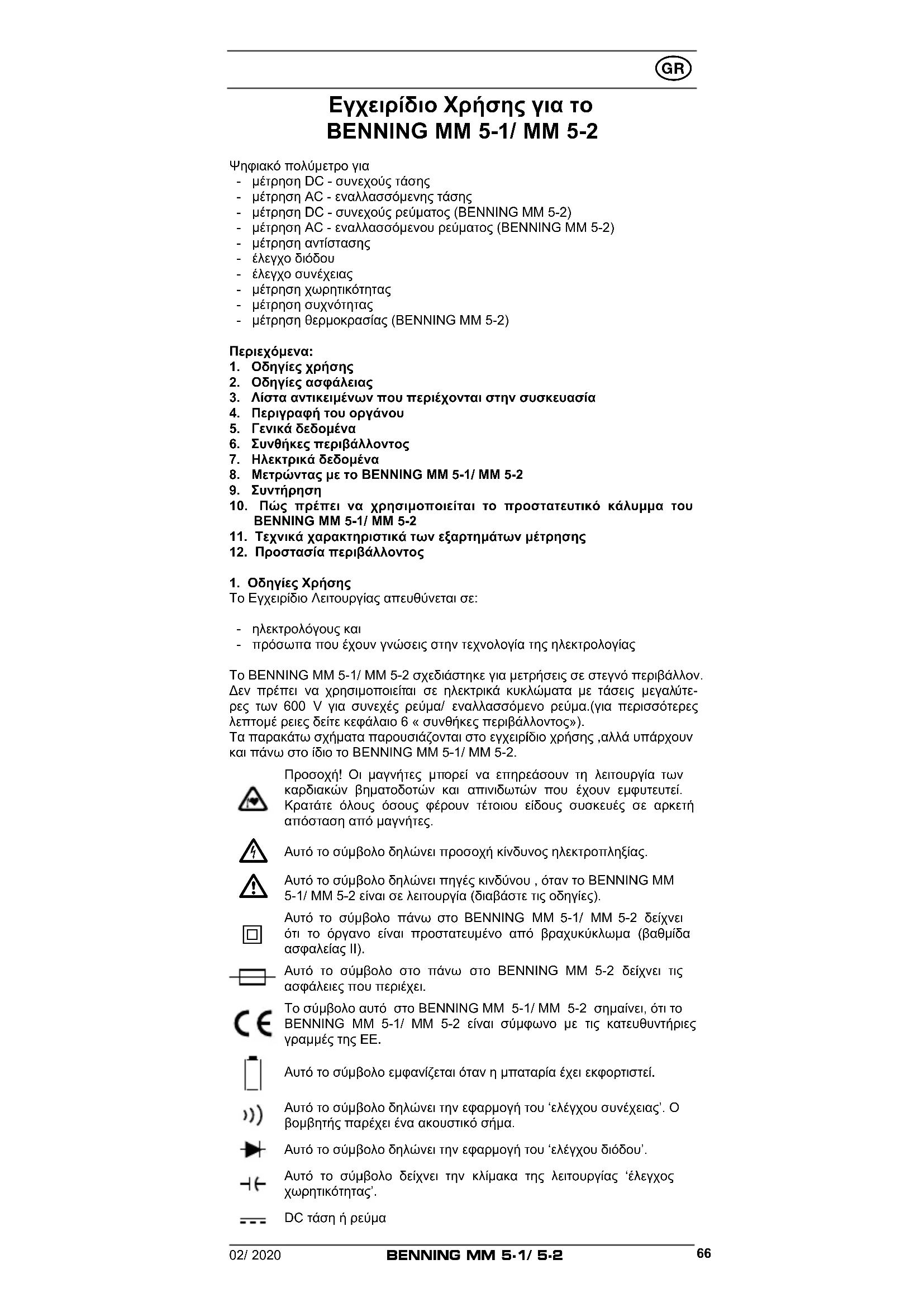 Το Εγχειρίδιο Λειτουργίας απευθύνεται σε: - ηλεκτρολόγους και - πρόσωπα που έχουν γνώσεις στην τεχνολογία της ηλεκτρολογίας Το BENNING MM 5-1/ MM 5-2 σχεδιάστηκε για μετρήσεις σε στεγνό περιβάλλον. Δεν πρέπει να χρησιμοποιείται σε ηλεκτρικά κυκλώματα με τάσεις μεγαλύτε- ρες των 600 V για συνεχές ρεύμα/ εναλλασσόμενο ρεύμα.(για περισσότερες λεπτομέ ρειες δείτε κεφάλαιο 6 « συνθήκες περιβάλλοντος»). Τα παρακάτω σχήματα παρουσιάζονται στο εγχειρίδιο χρήσης ,αλλά υπάρχουν και πάνω στο ίδιο το BENNING MM 5-1/ MM 5-2. Προσοχή! Οι μαγνήτες μπορεί να επηρεάσουν τη λειτουργία των καρδιακών βηματοδοτών και απινιδωτών που έχουν εμφυτευτεί. Κρατάτε όλους όσους φέρουν τέτοιου είδους συσκευές σε αρκετή απόσταση από μαγνήτες.