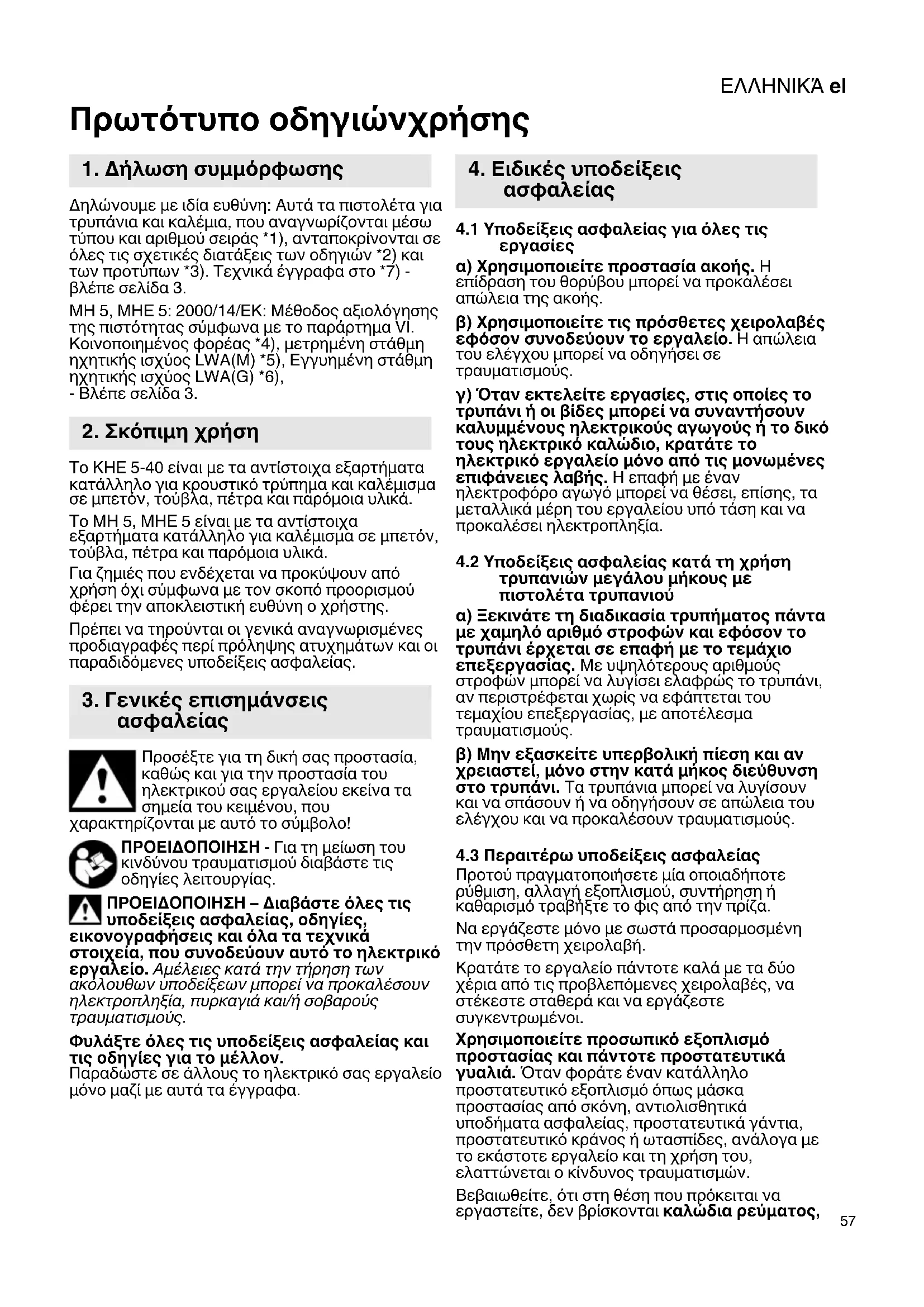 Σε πεπιπωση συνεχούς λειτουργίας Σεργαλείο εξακολουθείνα λειτουργείν, av σας Σεφύγει αὐτο τόχερι. Γ' autó va κρατάτε Σεργαλείο πάντοτε καλά με τα δύοχερia anó τό Σποβλεπόμενες χειρολαβές, va στέκεοτε Σταθερά και εργαζεστέ συγκεντρωμένοι.