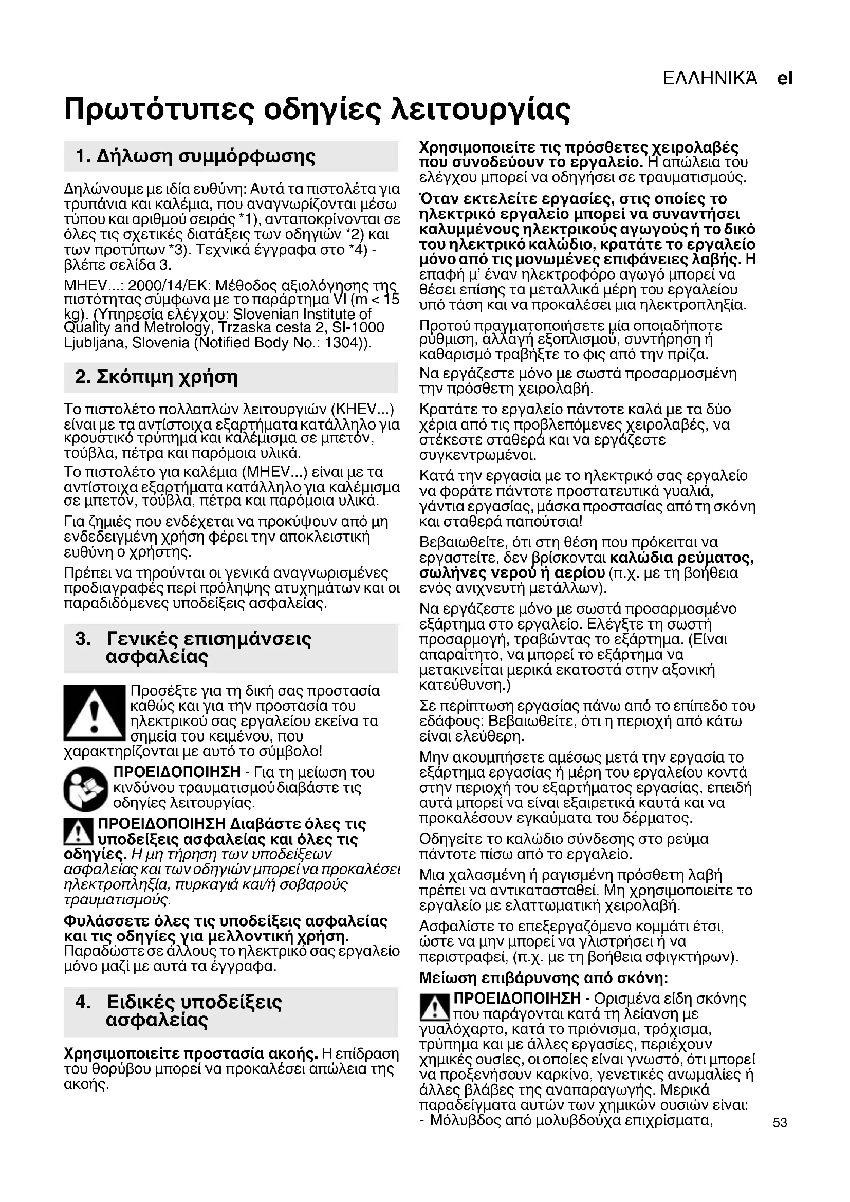 Πρωτότυπες οδηγίες λειτουργίας Δηλώνουμε με ιδία ευθύνη: Αυτά τα πιστολέτα για τρυπάνια και καλέμια, που αναγνωρίζονται μέσω τύπου και αριθμού σειράς *1), ανταποκρίνονται σε όλες τις σχετικές διατάξεις των οδηγιών *2) και των προτύπων *3). Τεχνικά έγγραφα στο *4) - βλέπε σελίδα 3. MHEV...: 2000/14/EΚ: Μέθοδος αξιολόγησης της πιστότητας σύμφωνα με το παράρτημα VI (m < 15 kg). (Υπηρεσία ελέγχου: Slovenian Institute of Quality and Metrology, Trzaska cesta 2, SI-1000 Ljubljana, Slovenia (Notified Body No.: 1304)). Το πιστολέτο πολλαπλών λειτουργιών (KHEV...) είναι με τα αντίστοιχα εξαρτήματα κατάλληλο για κρουστικό τρύπημα και καλέμισμα σε μπετόν, τούβλα, πέτρα και παρόμοια υλικά. Το πιστολέτο για καλέμια (MHEV...) είναι με τα αντίστοιχα εξαρτήματα κατάλληλο για καλέμισμα σε μπετόν, τούβλα, πέτρα και παρόμοια υλικά. Για ζημιές που ενδέχεται να προκύψουν από μη ενδεδειγμένη χρήση φέρει την αποκλειστική