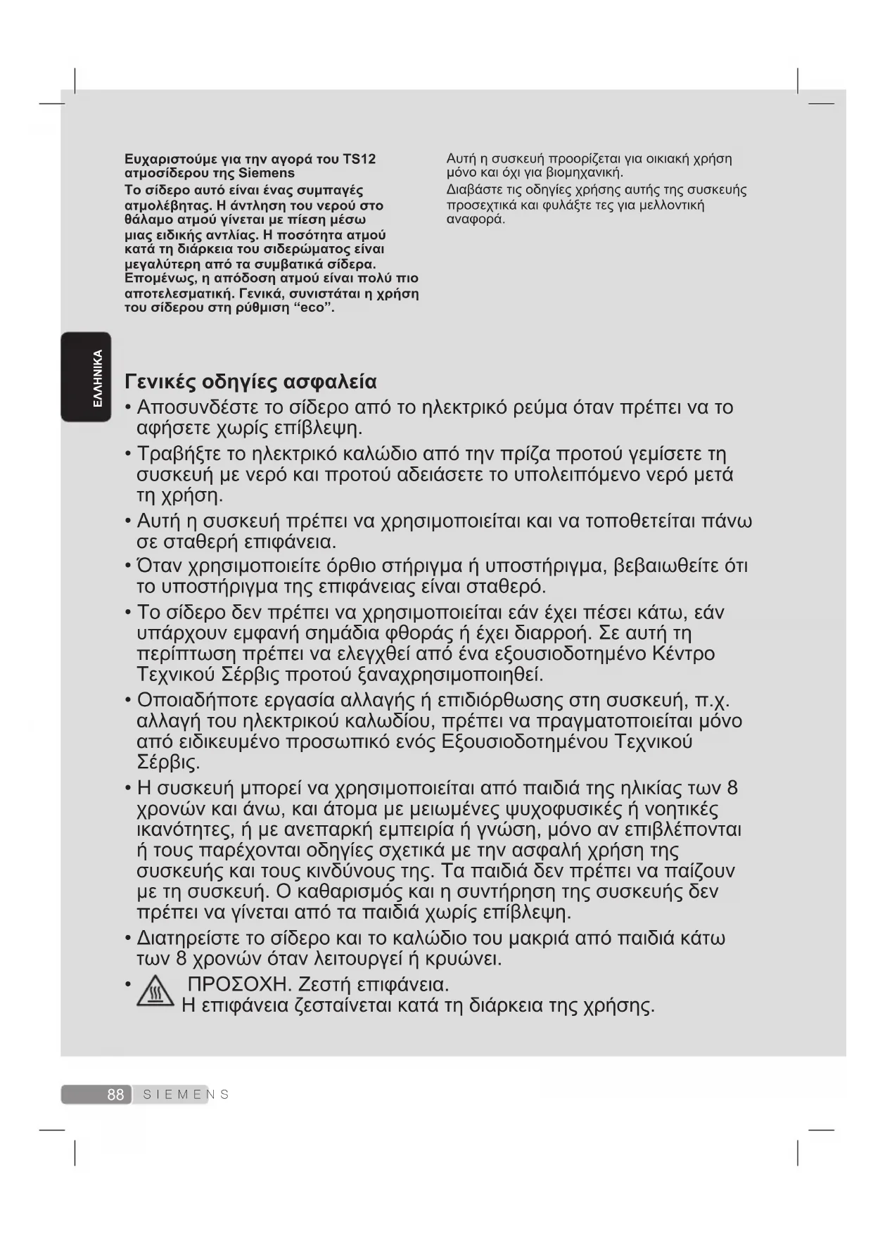 ΠΡΟΣΟΧΗ.Ζεστήεπιφάνεια. Ηεπιφάνειαζεσταίνεταικατάτηδιάρκειατηςχρήσης. Αυτήησυσκευήπροορίζεταιγιαοικιακήχρήση μόνοκαιόχιγιαβιομηχανική. Διαβάστετιςοδηγίεςχρήσηςαυτήςτηςσυσκευής προσεχτικάκαιφυλάξτετεςγιαμελλοντική αναφορά.89 S I E M E N S