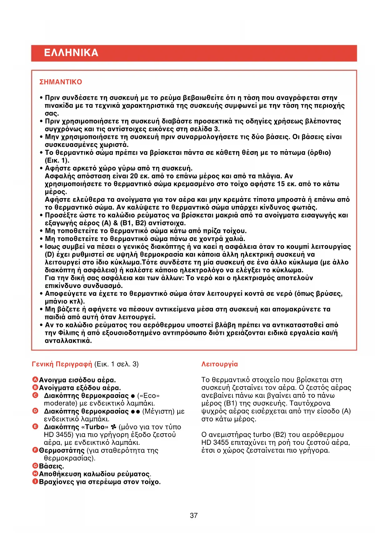 Γενική Περιγραφή (Eικ. 1 σελ. 3) A Aνοιγµα εισδου αέρα. B Aνοίγµατα εξδου αέρα. C ∆ιακπτης θερµοκρασίας 1 («Eco» moderate) µε ενδεικτικ' λαµπάκι. D ∆ιακπτης θερµοκρασίας 2 (Mέγιστη) µε ενδεικτικ' λαµπάκι. E ∆ιακπτης «Turbo» > (µ'νο για τον τύπο HD 3455) για πιο γρήγορη έξοδο ζεστού αέρα, µε ενδεικτικ' λαµπάκι. F Θερµοστάτης (για σταθερ'τητα της θερµοκρασίας). G Bάσεις. H Aποθήκευση καλωδίου ρεύµατος. I Bραχίονες για στερέωµα στον τοίχο.