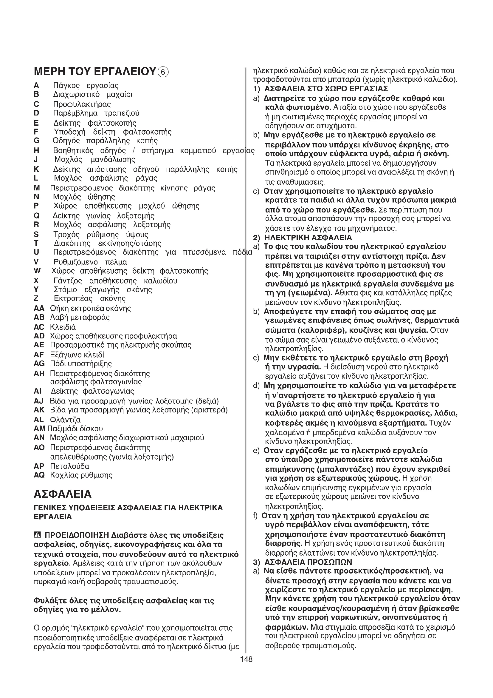 - ΠΡΟEΙΔΟΠΟΙΗΣΗ Διαβάστε όλες τις υποδείξεις ασφαλείας, οδηγίες, εικονογραφήσεις και όλα τα τεχνικά στοιχεία, που συνοδεύουν αυτό το ηλεκτρικό εργαλείο. Αμέλειες κατά την τήρηση των ακόλουθων υποδείξεων μπορεί να προκαλέσουν ηλεκτροπληξία, πυρκαγιά και/ή σοβαρούς τραυματισμούς. Φυλάξτε όλες τις υποδείξεις ασφαλείας και τις οδηγίες για το μέλλον. Ο ορισμός “ηλεκτρικό εργαλείο” που χρησιμοποιείται στις προειδοποιητικές υποδείξεις αναφέρεται σε ηλεκτρικά εργαλεία που τροφοδοτούνται από το ηλεκτρικό δίκτυο (με149 ασφαλείας μειώνουν τον κίνδυνο από τυχόν αθέλητη εκκίνηση του ηλεκτρικού εργαλείου. d) Διαφυλάγετε τα ηλεκτρικά εργαλεία που δε χρησιμοποιείτε μακριά από παιδιά. Μην αφήνετε άτομα που δεν είναι εξοικειωμένα με το ηλεκτρικό εργαλείο ή δεν έχουν διαβάσει αυτές τις οδηγίες χρήσης να το χρησιμοποιήσουν. Τα ηλεκτρικά εργαλεία είναι επικίνδυνα όταν χρησιμοποιούνται από άπειρα πρόσωπα. e) Φροντίζετε τα ηλεκτρικά εργαλεία και τα εξάρτημα με επιμέλεια. Ελέγχετε, αν τα κινούμενα εξαρτήματα λειτουργούν άψογα, χωρίς να μπλοκάρουν, ή μήπως έχουν σπάσει ή φθαρεί τυχόν εξαρτήματα τα οποία επηρεάζουν τον τρόπο λειτουργίας του ηλεκτρικού εργαλείου. Δώστε αυτά τα χαλασμένα εξαρτήματα για επισκευή πριν τα ξαναχρησιμοποιήσετε. Η κακή συντήρηση των ηλεκτρικών εργαλείων αποτελεί αιτία πολλών ατυχημάτων. f) Διατηρείτε τα κοπτικά εργαλεία κοφτερά και καθαρά. Τα κοπτικά εργαλεία που συντηρούνται με προσοχή μπορούν να οδηγηθούν εύκολα και να ελεγχθούν καλύτερα. g) Xρησιμοποιείτε τα ηλεκτρικά εργαλεία, τα εξαρτήματα, τα χρησιμοποιήσιμα εργαλεία κτλ. σύμφωνα με τις παρούσες οδηγίες καθώς. Λαμβάνετε ταυτόχρονα υπόψην σας τις συνθήκες εργασίας και την υπό εκτέλεση εργασία. Η χρήση του ηλεκτρικού εργαλείου για άλλες εκτός από τις προβλεπόμενες εργασίες μπορεί να δημιουργήσει επικίνδυνες καταστάσεις. h) Διατηρείτε τις λαβές και επιφάνειες λαβής στεγνές, καθαρές και ελεύθερες από λάδι και γράσο. Οι ολισθηρές λαβές και επιφάνειες λαβής δεν επιτρέπουν κανέναν ασφαλή χειρισμό και έλεγχο του ηλεκτρικού εργαλείου σε τυχόν απρόβλεπτες καταστάσεις.