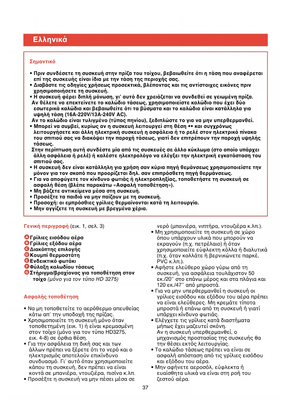 - Mην αγγίζετε τη συσκευή µε βρεγµένα χέρια. Ελληνικά• Mη χρησιµοποιείτε τη συσκευή επάνω σε χαλιά που έχουν πολύ µεγάλο πέλος. Mνο για τον τύπο HD3275 Aν εγκαταστήσετε τη συσκευή στο λουτρ!, πρέπει να τοποθετηθεί έτσι ώστε... - το άτοµο που κάνει µπάνιο ή ντουζ να µην µπορεί να αγγίζει τους διακ!πτες και τα άλλα χειριστήρια της συσκευής. - έξω απ! τις έγχρωµες περιοχές που φαίνονται στις εικ. 2 και 3. Φύλαξη του καλωδίου τάσεως Mπορείτε να αποθηκεύσετε το καλώδιο που περισσεύει σπρώχνοντάς το να µπει στην υποδοχή στο πίσω µέρος της συσκευής. Σηµείωση: Mη χρησιµοποιείτε τη συσκευή !ταν το καλώδιο τάσεως είναι µέσα στη