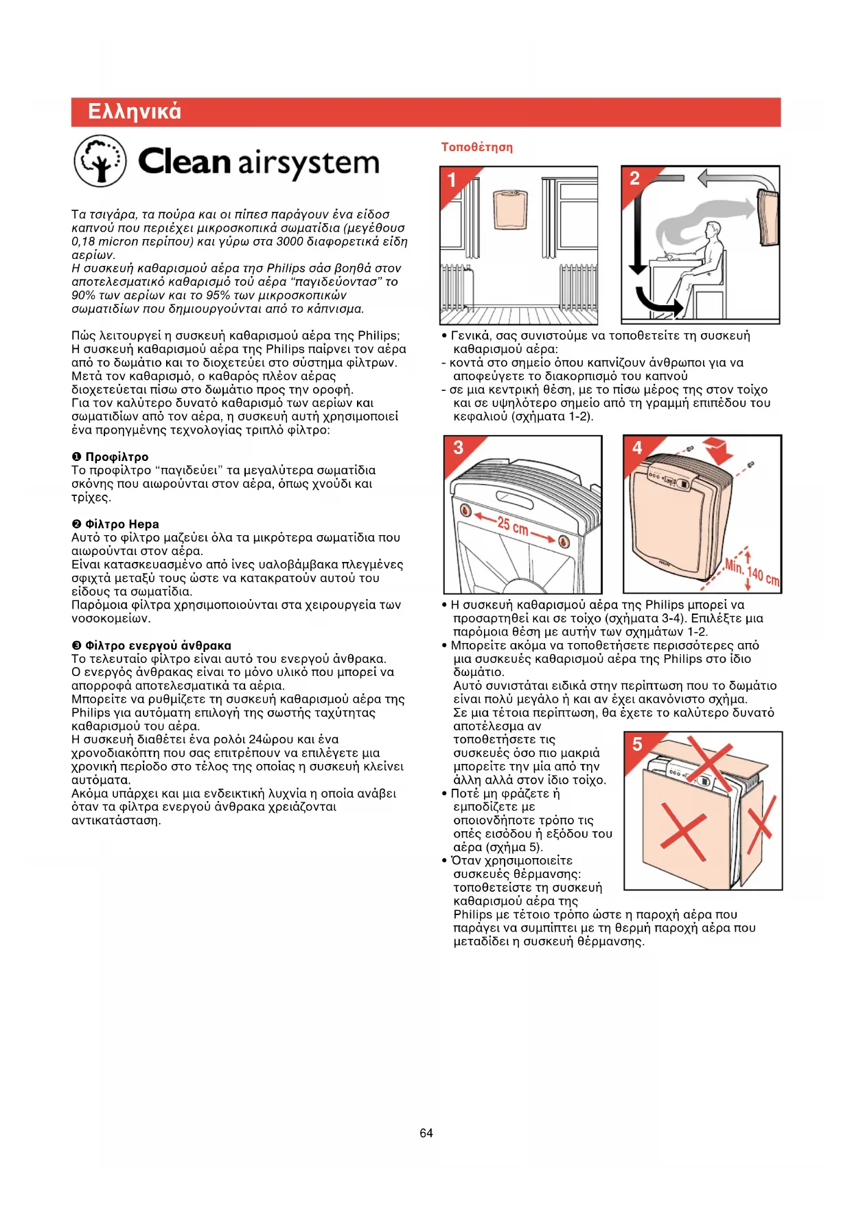 63Τοποθέτηση• Γενικά, σας συνιστούµε να τοποθετείτε τη συσκευήκαθαρισµού αέρα:- κοντά στο σηµείο που καπνίζουν άνθρωποι για νααποφεύγετε το διακορπισµ του καπνού- σε µια κεντρική θέση, µε το πίσω µέρος της στον τοίχοκαι σε υψηλτερο σηµείο απ τη γραµµή επιπέδου τουκεφαλιού (σχήµατα 1-2).• Η συσκευή καθαρισµού αέρα της Philips µπορεί ναπροσαρτηθεί και σε τοίχο (σχήµατα 3-4). Επιλέξτε µιαπαρµοια θέση µε αυτήν των σχηµάτων 1-2. • Μπορείτε ακµα να τοποθετήσετε περισστερες απµια συσκευές καθαρισµού αέρα της Philips στο ίδιοδωµάτιο.Αυτ συνιστάται ειδικά στην περίπτωση που το δωµάτιοείναι πολύ µεγάλο ή και αν έχει ακαννιστο σχήµα.Σε µια τέτοια περίπτωση, θα έχετε το καλύτερο δυναταποτέλεσµα αντοποθετήσετε τιςσυσκευές σο πιο µακριάµπορείτε την µία απ τηνάλλη αλλά στον ίδιο τοίχο.• Ποτέ µη φράζετε ήεµποδίζετε µεοποιονδήποτε τρπο τιςοπές εισδου ή εξδου τουαέρα (σχήµα 5).• 9ταν χρησιµοποιείτεσυσκευές θέρµανσης:τοποθετείστε τη συσκευήκαθαρισµού αέρα τηςPhilips µε τέτοιο τρπο ώστε η παροχή αέρα πουπαράγει να συµπίπτει µε τη θερµή παροχή αέρα πουµεταδίδει η συσκευή θέρµανσης.Τα τσιγάρα, τα πούρα και οι πίπεσ παράγουν ένα είδοσκαπνού που περιέχει µικροσκοπικά σωµατίδια (µεγέθουσ0,18 micron περίπου) και γύρω στα 3000 διαφορετικά είδηαερίων.Η συσκευή καθαρισµού αέρα τησ Philips σάσ βοηθά στοναποτελεσµατικ καθαρισµ τού αέρα “παγιδεύοντασ” το90% των αερίων και το 95% των µικροσκοπικώνσωµατιδίων που δηµιουργούνται απ το κάπνισµα.Πώς λειτουργεί η συσκευή καθαρισµού αέρα της Philips;Η συσκευή καθαρισµού αέρα της Philips παίρνει τον αέρααπ το δωµάτιο και το διοχετεύει στο σύστηµα φίλτρων.Μετά τον καθαρισµ, ο καθαρς πλέον αέραςδιοχετεύεται πίσω στο δωµάτιο προς την οροφή.Για τον καλύτερο δυνατ καθαρισµ των αερίων καισωµατιδίων απ τον αέρα, η συσκευή αυτή χρησιµοποιείένα προηγµένης τεχνολογίας τριπλ φίλτρο:❶ ΠροφίλτροΤο προφίλτρο “παγιδεύει” τα µεγαλύτερα σωµατίδιασκνης που αιωρούνται στον αέρα, πως χνούδι καιτρίχες.❷ Φίλτρο HepaΑυτ το φίλτρο µαζεύει λα τα µικρτερα σωµατίδια πουαιωρούνται στον αέρα. Είναι κατασκευασµένο απ ίνες υαλοβάµβακα πλεγµένεςσφιχτά µεταξύ τους ώστε να κατακρατούν αυτού τουείδους τα σωµατίδια.Παρµοια φίλτρα χρησιµοποιούνται στα χειρουργεία τωννοσοκοµείων.❸ Φίλτρο ενεργού άνθρακαΤο τελευταίο φίλτρο είναι αυτ του ενεργού άνθρακα.Ο ενεργς άνθρακας είναι το µνο υλικ που µπορεί νααπορροφά αποτελεσµατικά τα αέρια.Μπορείτε να ρυθµίζετε τη συσκευή καθαρισµού αέρα τηςPhilips για αυτµατη επιλογή της σωστής ταχύτηταςκαθαρισµού του αέρα. Η συσκευή διαθέτει ένα ρολι 24ώρου και έναχρονοδιακπτη που σας επιτρέπουν να επιλέγετε µιαχρονική περίοδο στο τέλος της οποίας η συσκευή κλείνειαυτµατα.Ακµα υπάρχει και µια ενδεικτική λυχνία η οποία ανάβειταν τα φίλτρα ενεργού άνθρακα χρειάζονταιαντικατάσταση.