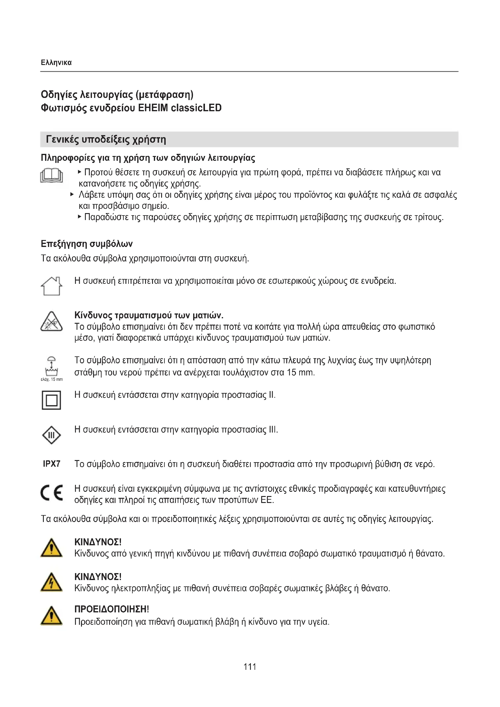 Οδηγίες λειτουργίας (μετάφραση) Φωτισμός ενυδρείου EHEIM classicLED Γενικές υποδείξεις χρήστη Πληροφορίες για τη χρήση των οδηγιών λειτουργίας ▶ Προτού θέσετε τη συσκευή σε λειτουργία για πρώτη φορά, πρέπει να διαβάσετε πλήρως και να κατανοήσετε τις οδηγίες χρήσης. ▶ Λάβετε υπόψη σας ότι οι οδηγίες χρήσης είναι μέρος του προϊόντος και φυλάξτε τις καλά σε ασφαλές και προσβάσιμο σημείο. ▶ Παραδώστε τις παρούσες οδηγίες χρήσης σε περίπτωση μεταβίβασης της συσκευής σε τρίτους. Επεξήγηση συμβόλων Τα ακόλουθα σύμβολα χρησιμοποιούνται στη συσκευή. Η συσκευή επιτρέπεται να χρησιμοποιείται μόνο σε εσωτερικούς χώρους σε ενυδρεία. Κίνδυνος τραυματισμού των ματιών. Το σύμβολο επισημαίνει ότι δεν πρέπει ποτέ να κοιτάτε για πολλή ώρα απευθείας στο φωτιστικό μέσο, γιατί διαφορετικά υπάρχει κίνδυνος τραυματισμού των ματιών. Το σύμβολο επισημαίνει ότι η απόσταση από την κάτω πλευρά της λυχνίας έως την υψηλότερη στάθμη του νερού πρέπει να ανέρχεται τουλάχιστον στα 15 mm. Η συσκευή εντάσσεται στην κατηγορία προστασίας II. Η συσκευή εντάσσεται στην κατηγορία προστασίας III. Το σύμβολο επισημαίνει ότι η συσκευή διαθέτει προστασία από την προσωρινή βύθιση σε νερό. Η συσκευή είναι εγκεκριμένη σύμφωνα με τις αντίστοιχες εθνικές προδιαγραφές και κατευθυντήριες οδηγίες και πληροί τις απαιτήσεις των προτύπων ΕΕ. Τα ακόλουθα σύμβολα και οι προειδοποιητικές λέξεις χρησιμοποιούνται σε αυτές τις οδηγίες λειτουργίας.