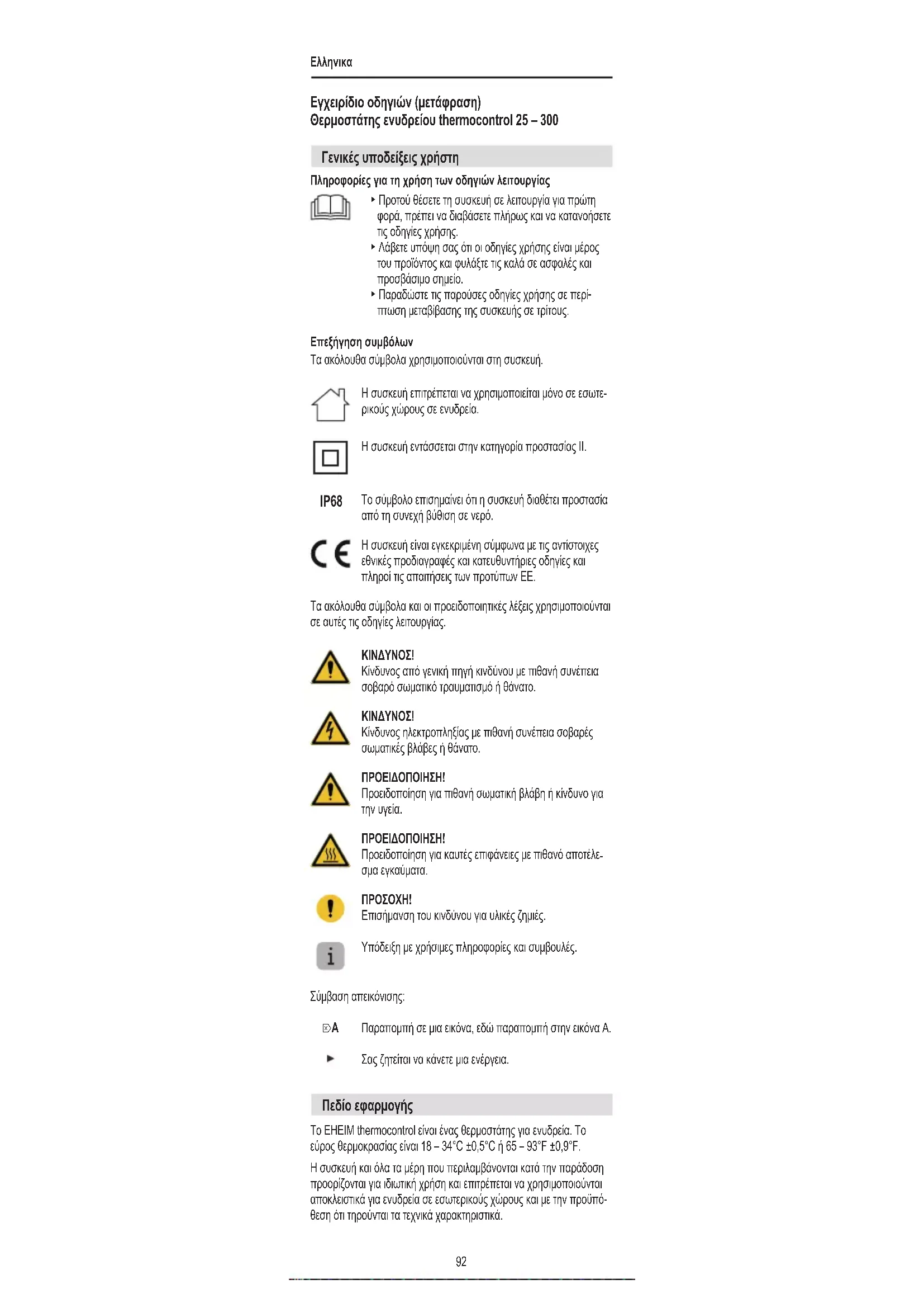 Πεδίο εφαρμογής Το EHEIM thermocontrol είναι ένας θερμοστάτης για ενυδρεία. Το εύρος θερμοκρασίας είναι 18 – 34°C ±0,5°C ή 65 – 93°F ±0,9°F. Η συσκευή και όλα τα μέρη που περιλαμβάνονται κατά την παράδοση προορίζονται για ιδιωτική χρήση και επιτρέπεται να χρησιμοποιούνται αποκλειστικά για ενυδρεία σε εσωτερικούς χώρους και με την προϋπό- θεση ότι τηρούνται τα τεχνικά χαρακτηριστικά.Ελληνικα