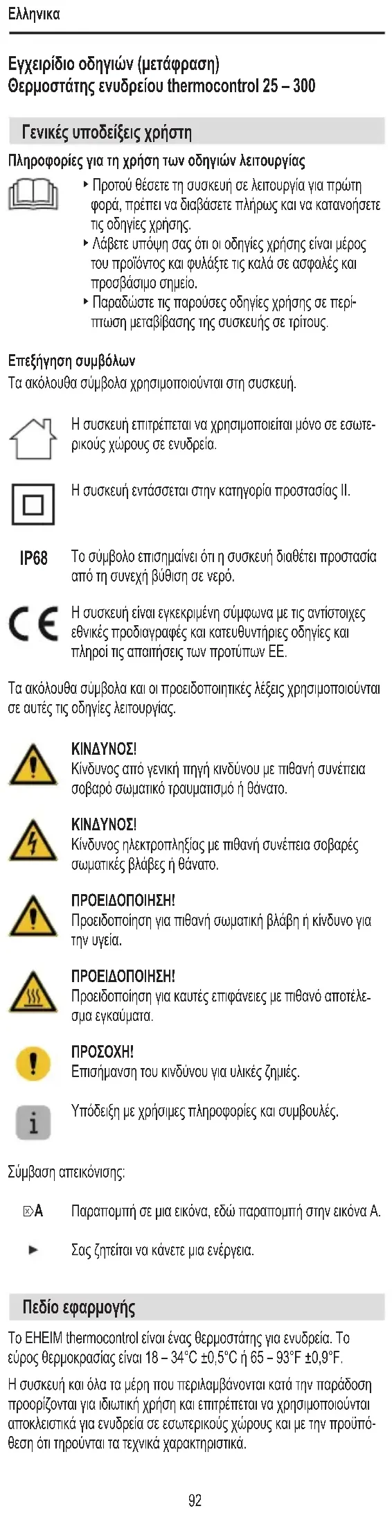 Πεδίο εφαρμογής Το EHEIM thermocontrol είναι ένας θερμοστάτης για ενυδρεία. Το εύρος θερμοκρασίας είναι 18 – 34°C ±0,5°C ή 65 – 93°F ±0,9°F. Η συσκευή και όλα τα μέρη που περιλαμβάνονται κατά την παράδοση προορίζονται για ιδιωτική χρήση και επιτρέπεται να χρησιμοποιούνται αποκλειστικά για ενυδρεία σε εσωτερικούς χώρους και με την προϋπό- θεση ότι τηρούνται τα τεχνικά χαρακτηριστικά.Ελληνικα