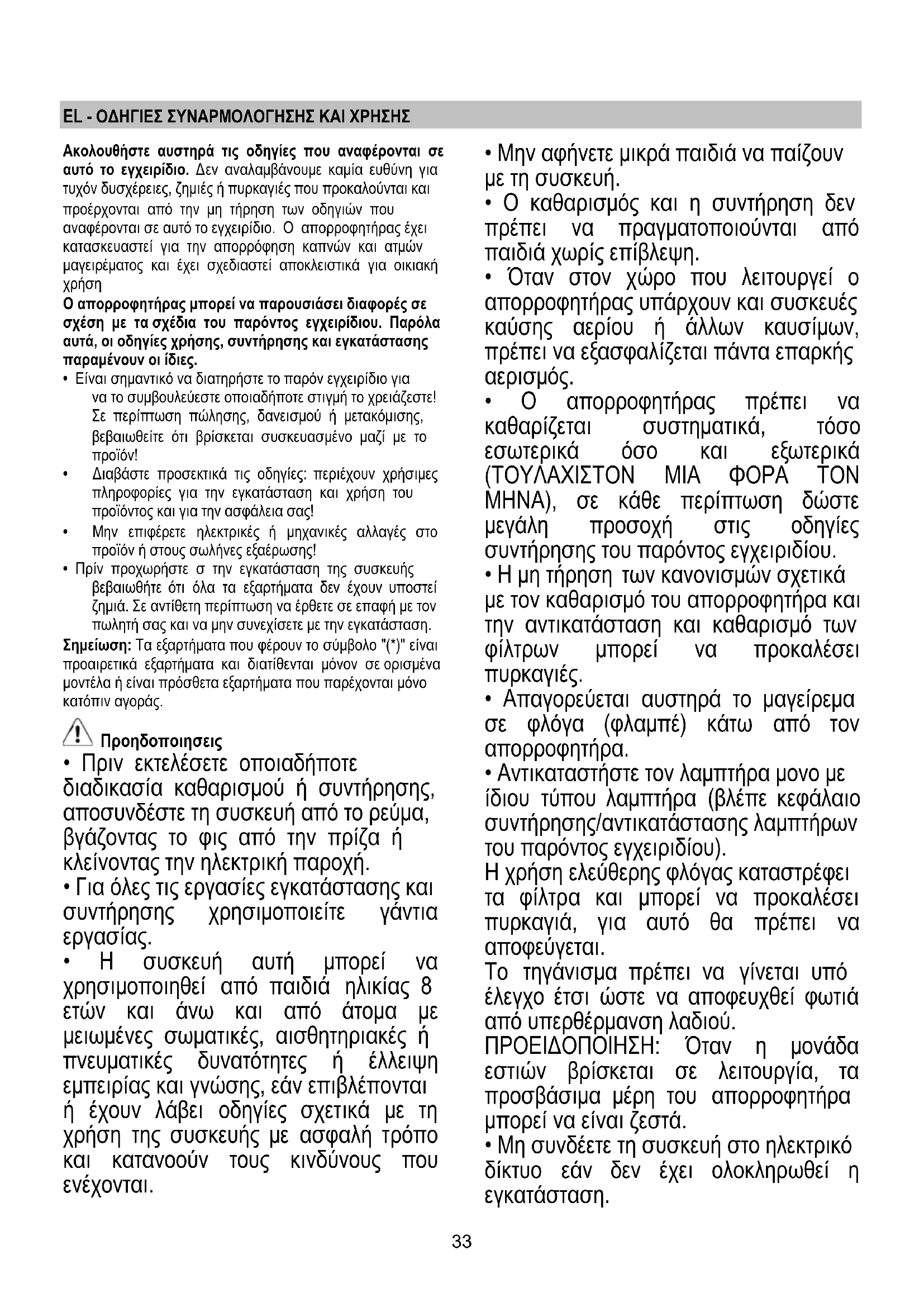 - Μη χρησιμοποιείτε ή μην αφήνετε τον απορροφητήρα χωρίς λάμπες σωστά τοποθετημένες, εξαιτίας ενδεχόμενου κινδύνου ηλεκτροπληξίας.