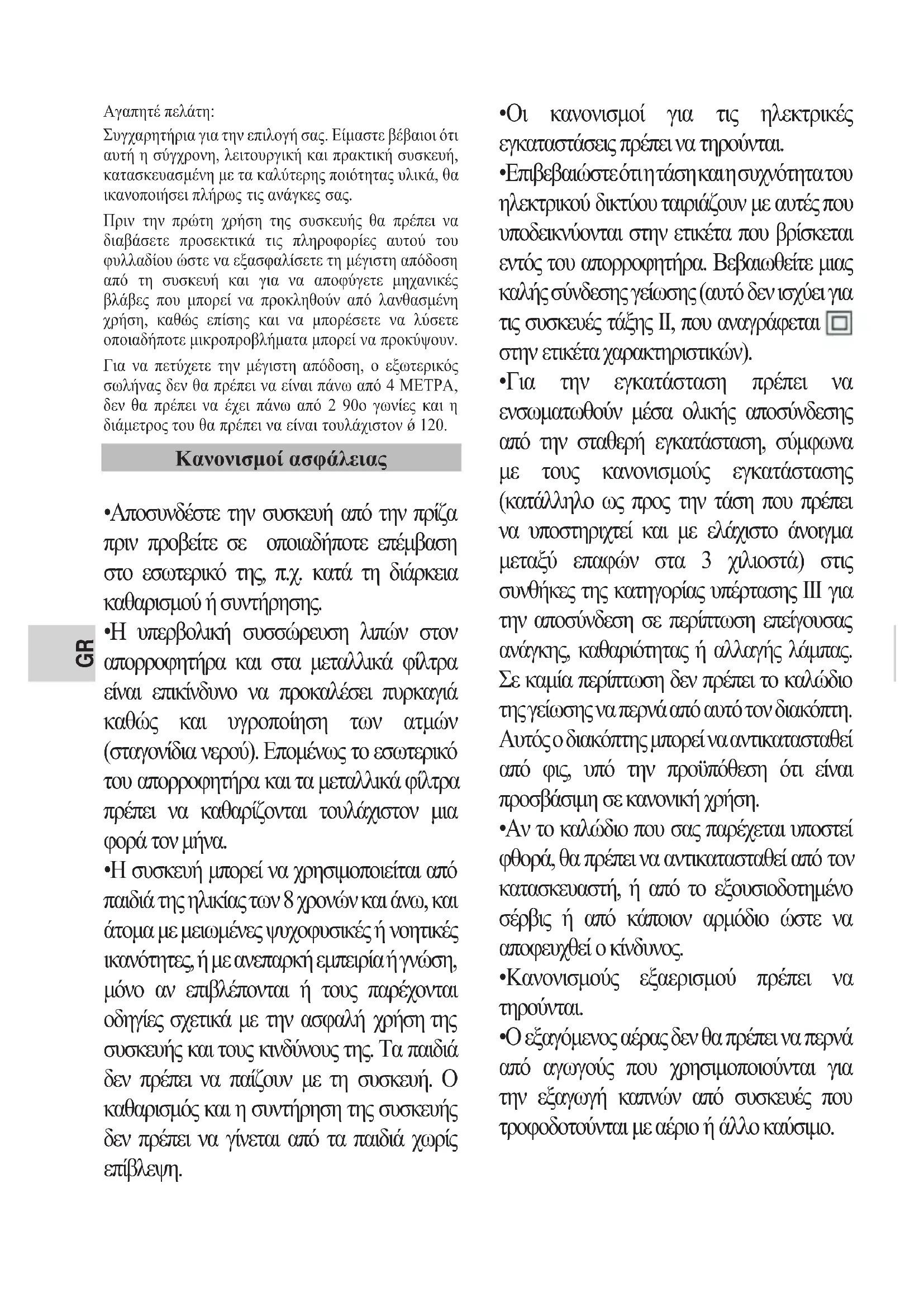 - Ο εξαγόμενος αέρας δεν θα πρέπει να περνά από αγωγούς που χρησιμοποιούνται για την εξαγωγή καπνών από συσκευές που τροφοδοτούνται με αέριο ή άλλο καύσιμο. Κανονισμοί ασφάλειαςGR