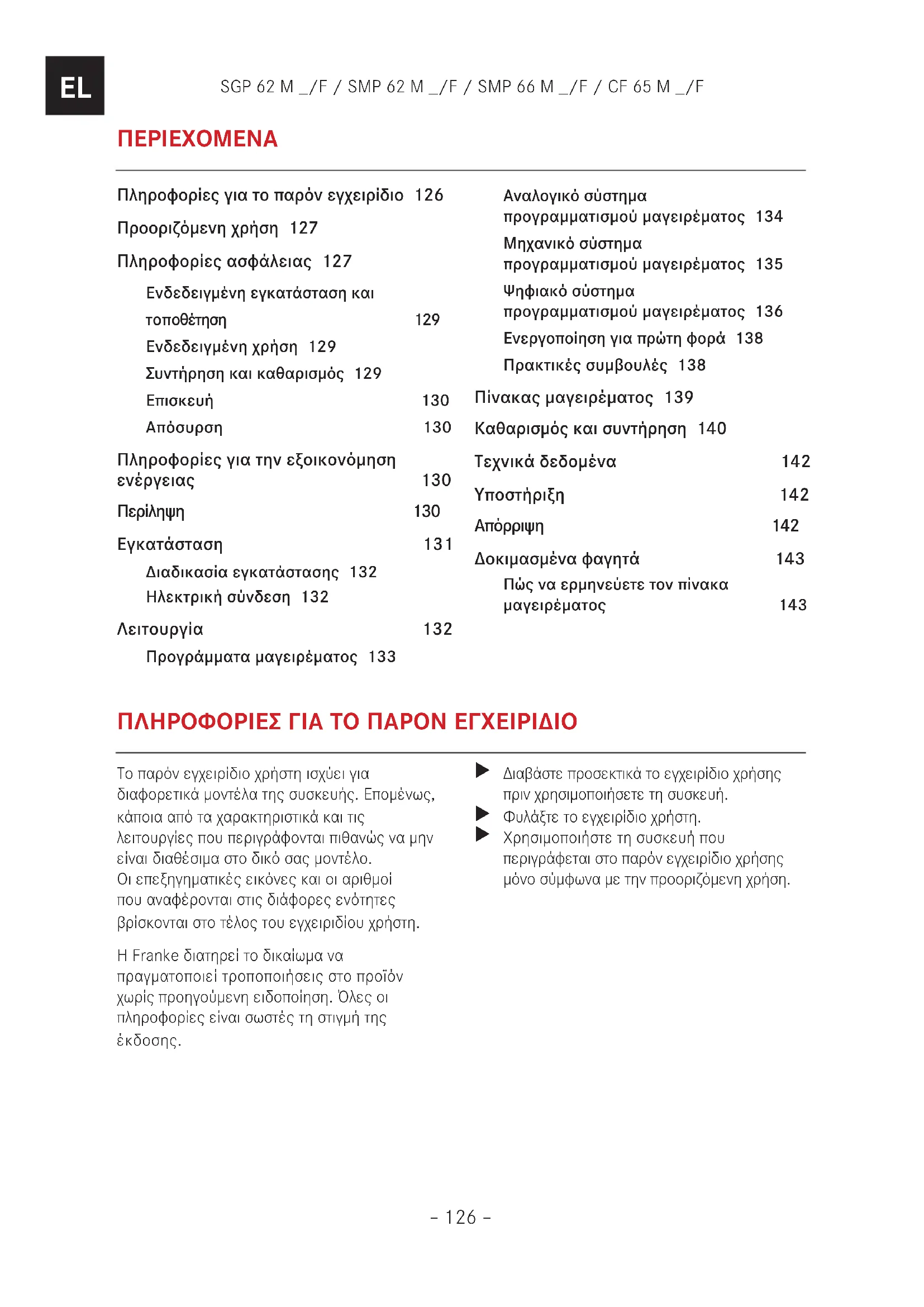 ΠΕΡΙΕΧΌΜΕΝΑ Πληροφορίες για το παρόν εγχειρίδιο 126 Προοριζόμενη χρήση 127 Πληροφορίες ασφάλειας 127 Ενδεδειγμένη εγκατάσταση και τοποθέτηση 129 Ενδεδειγμένη χρήση 129 Συντήρηση και καθαρισμός 129 Επισκευή 130 Απόσυρση 130 Πληροφορίες για την εξοικονόμηση ενέργειας 130 Περίληψη 130 Εγκατάσταση 131 Διαδικασία εγκατάστασης 132 Ηλεκτρική σύνδεση 132 Λειτουργία 132 Προγράμματα μαγειρέματος 133 Αναλογικό σύστημα προγραμματισμού μαγειρέματος 134 Μηχανικό σύστημα προγραμματισμού μαγειρέματος 135 Ψηφιακό σύστημα προγραμματισμού μαγειρέματος 136 Ενεργοποίηση για πρώτη φορά 138 Πρακτικές συμβουλές 138 Πίνακας μαγειρέματος 139 Καθαρισμός και συντήρηση 140 Τεχνικά δεδομένα 142 Υποστήριξη 142 Απόρριψη 142 Δοκιμασμένα φαγητά 143 Πώς να ερμηνεύετε τον πίνακα μαγειρέματος 143 ΠΛΗΡΌΦΌΡΙΕΣ ΓΙΑ ΤΌ ΠΑΡΌΝ ΕΓΧΕΙΡΙΔΙΌ Το παρόν εγχειρίδιο χρήστη ισχύει για διαφορετικά μοντέλα της συσκευής. Επομένως, κάποια από τα χαρακτηριστικά και τις λειτουργίες που περιγράφονται πιθανώς να μην είναι διαθέσιμα στο δικό σας μοντέλο. Οι επεξηγηματικές εικόνες και οι αριθμοί που αναφέρονται στις διάφορες ενότητες βρίσκονται στο τέλος του εγχειριδίου χρήστη. Η Franke διατηρεί το δικαίωμα να πραγματοποιεί τροποποιήσεις στο προϊόν χωρίς προηγούμενη ειδοποίηση. Όλες οι πληροφορίες είναι σωστές τη στιγμή της