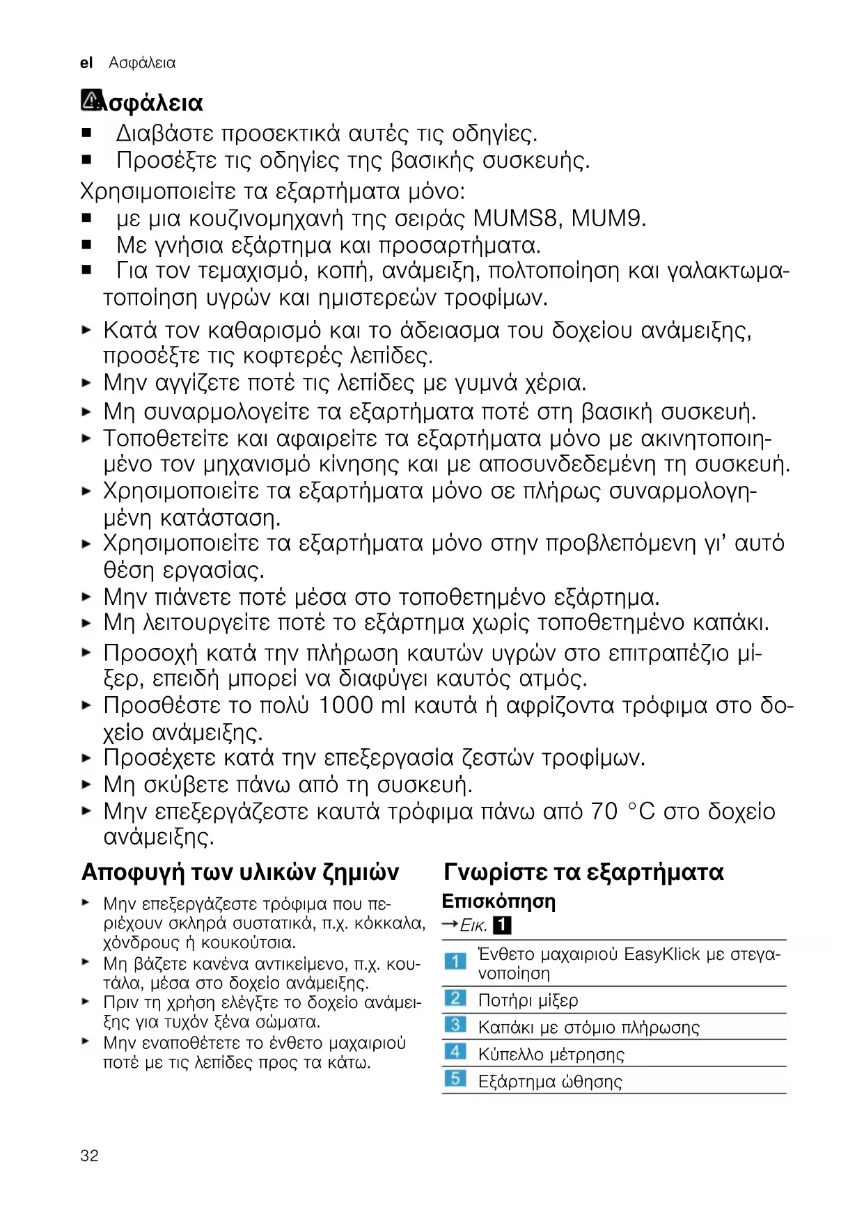 Αποφυγή των υλικών ζημιώνΑποφυγή των υλικών ζημιών Μην επεξεργάζεστε τρόφιμα που πε- ριέχουν σκληρά συστατικά, π.χ. κόκκαλα, χόνδρους ή κουκούτσια. Μη βάζετε κανένα αντικείμενο, π.χ. κου- τάλα, μέσα στο δοχείο ανάμειξης. Πριν τη χρήση ελέγξτε το δοχείο ανάμει- ξης για τυχόν ξένα σώματα. Μην εναποθέτετε το ένθετο μαχαιριού ποτέ με τις λεπίδες προς τα κάτω. Γνωρίστε τα εξαρτήματαΓνωρίστε τα εξαρτήματα