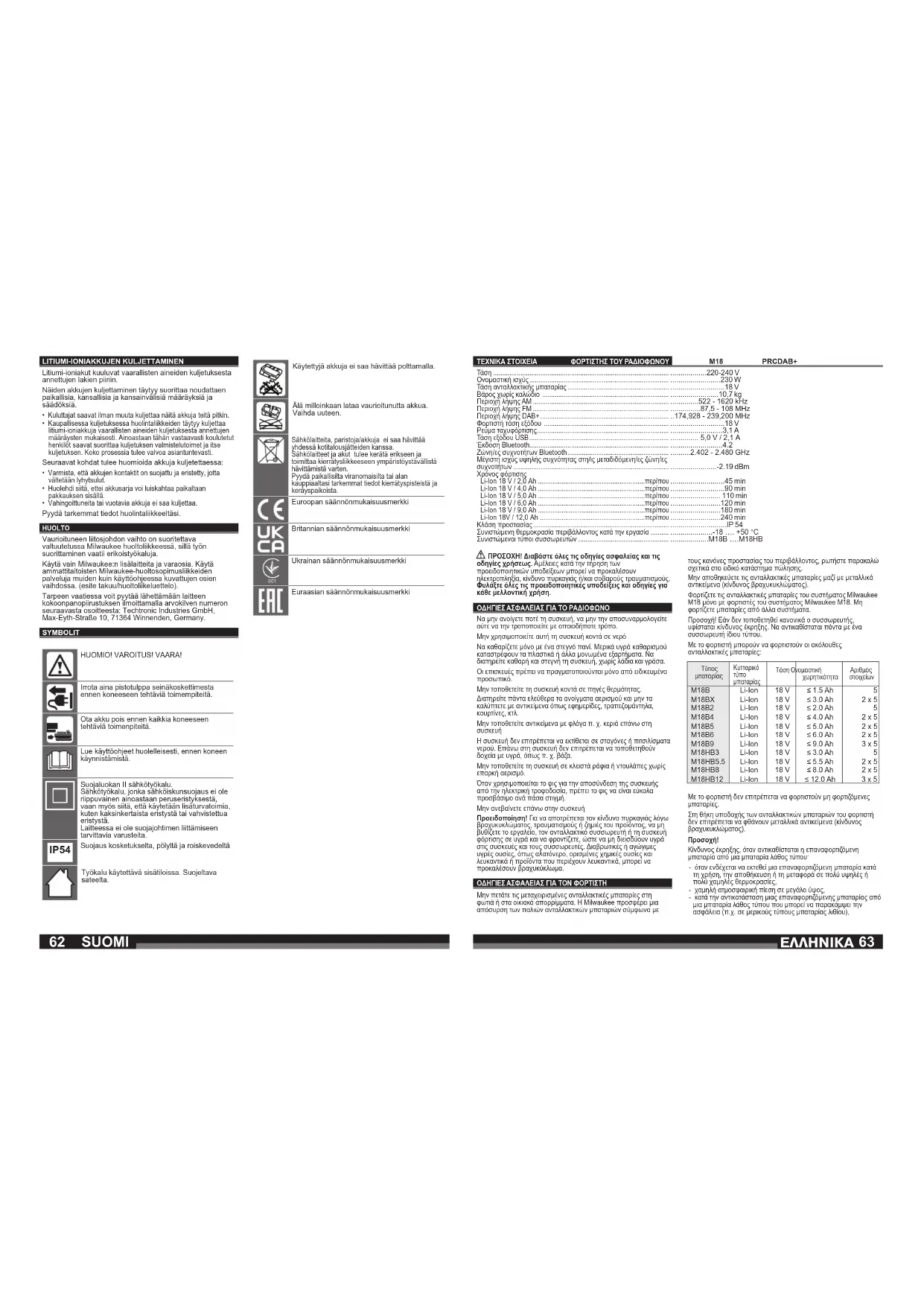 - Μη ρίχνετε στη φωτιά τους μεταχειρισμένους συσσωρευτές. Μη φορτίζετε καμία κατεστραμμένη ανταλλακτική μπαταρία, αλλά αντικαθιστάτε την αμέσως. Ηλεκτρικά μηχανήματα, μπαταρίες/συσσωρευτές δεν επιτρέπεται να απορρίπτονται μαζί με τα οικιακά απορρίμματα. Ηλεκτρικά μηχανήματα και συσσωρευτές συλλέγονται ξεχωριστά και παραδίδονται προς ανακύκλωση με τρόπο φιλικό προς το περιβάλλον σε επιχείρηση επεξεργασίας απορριμμάτων. Ενημερωθείτε από τις τοπικές υπηρεσίες ή από ειδικευμένους εμπόρους σχετικά με κέντρα ανακύκλωσης και συλλογής απορριμμάτων. Ευρωπαϊκό σήμα πιστότητας Βρετανικό σήμα πιστότητας Ουκρανικό σήμα πιστότητας Ευρασιατικό σήμα πιστότητας6766 M18 PRCDAB+ p. 220