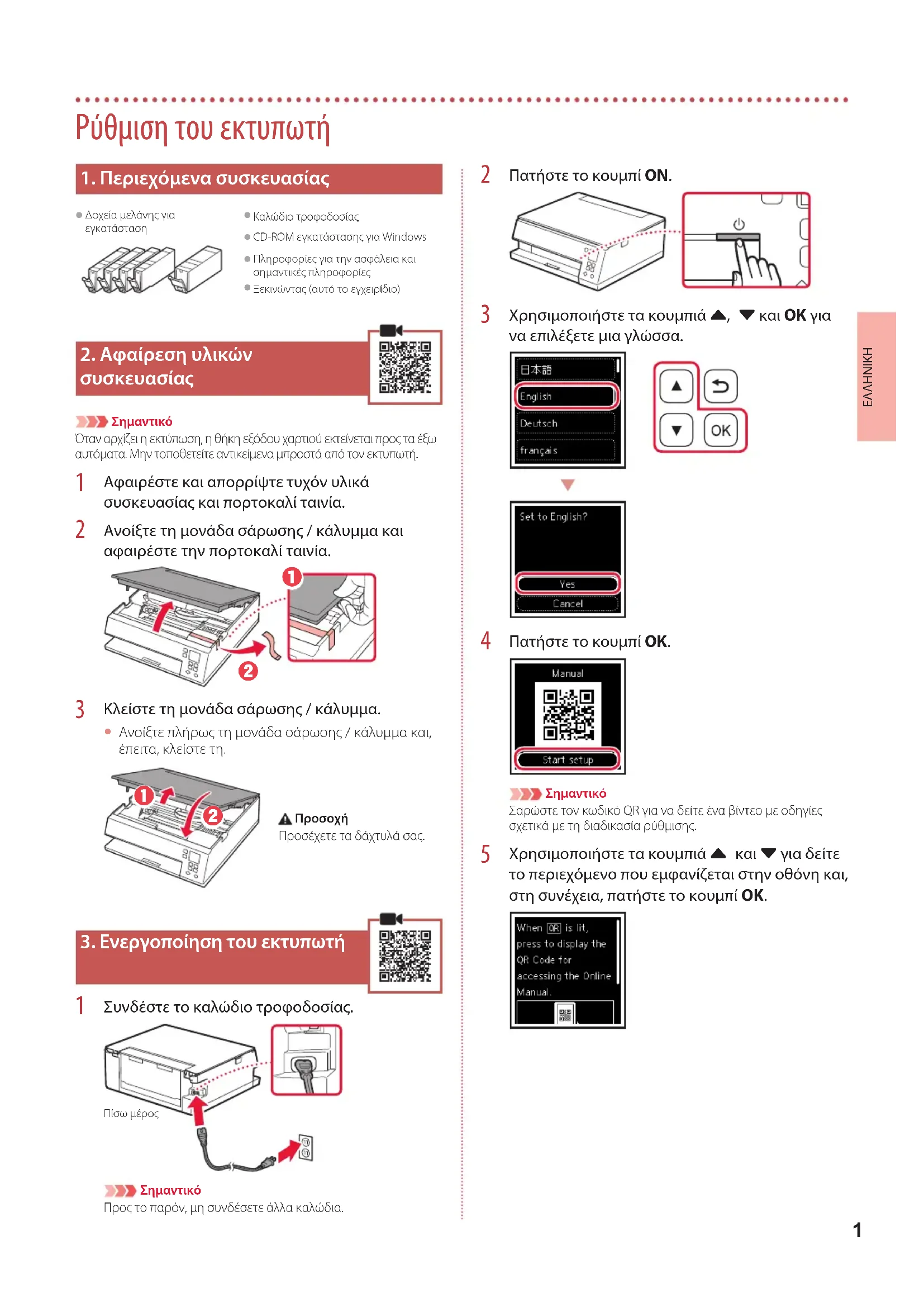 Δοχεία μελάνης για εγκατάσταση Καλώδιο τροφοδοσίας CD-ROM εγκατάστασης για Windows Πληροφορίες για την ασφάλεια και σημαντικές πληροφορίες Ξεκινώντας (αυτό το εγχειρίδιο)