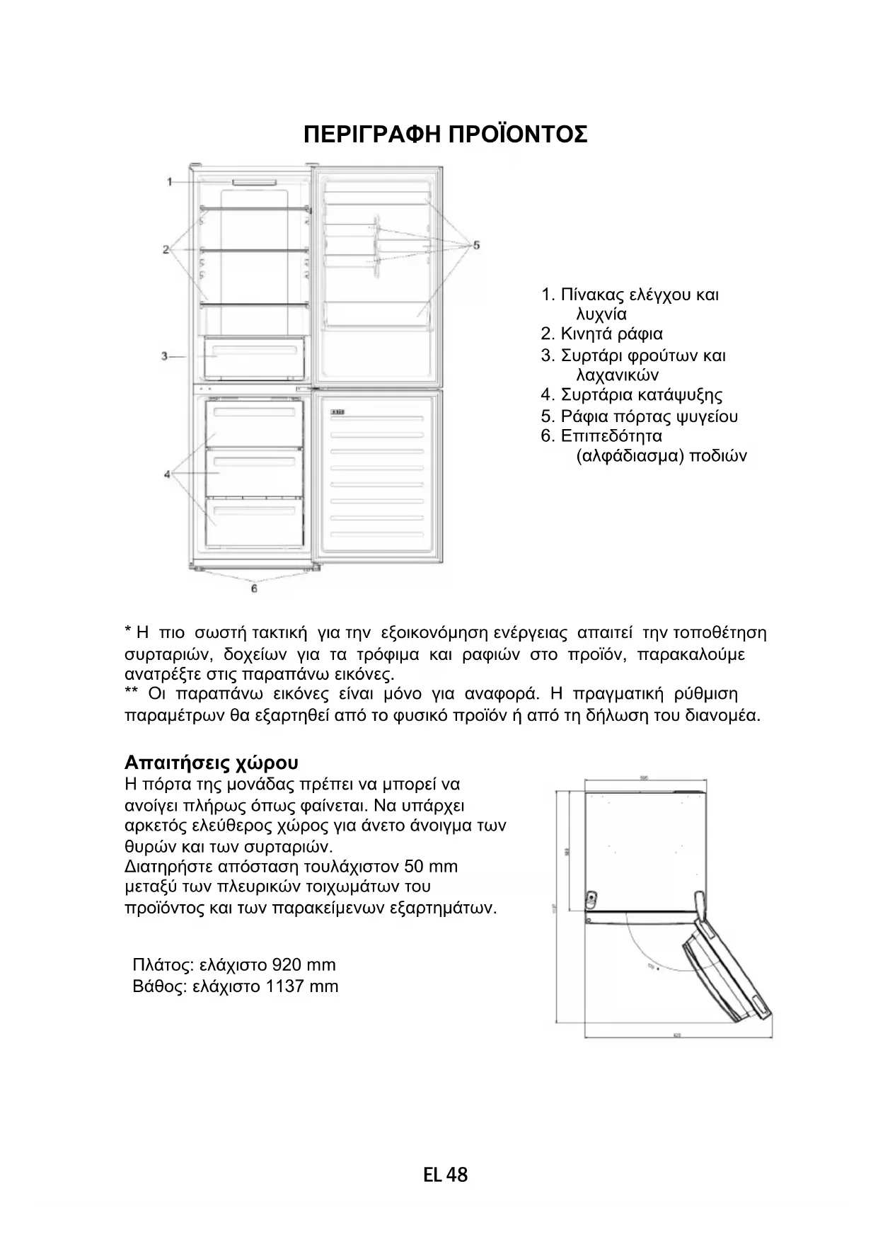 - Η πιο σωστή τακτική για την εξοικονόμηση ενέργειας απαιτεί την τοποθέτηση συρταριών, δοχείων για τα τρόφιμα και ραφιών στο προϊόν, παρακαλούμε ανατρέξτε στις παραπάνω εικόνες. ** Οι παραπάνω εικόνες είναι μόνο για αναφορά. Η πραγματική ρύθμιση παραμέτρων θα εξαρτηθεί από το φυσικό προϊόν ή από τη δήλωση του διανομέα. Απαιτήσεις χώρου Πλάτος: ελάχιστο 920 mm Βάθος: ελάχιστο 1137 mm Η πόρτα της μονάδας πρέπει να μπορεί να ανοίγει πλήρως όπως φαίνεται. Να υπάρχει αρκετός ελεύθερος χώρος για άνετο άνοιγμα των θυρών και των συρταριών. Διατηρήστε απόσταση τουλάχιστον 50 mm μεταξύ των πλευρικών τοιχωμάτων του προϊόντος και των παρακείμενων εξαρτημάτων.EL 49