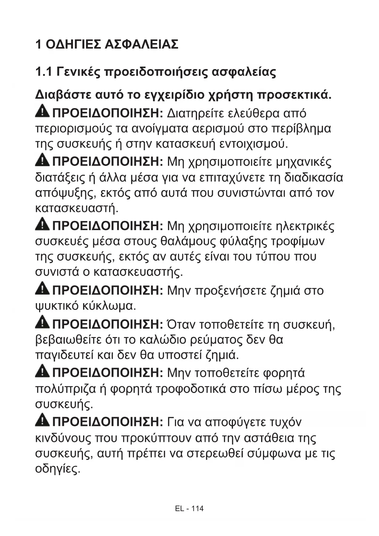 Διαβάστε αυτό το εγχειρίδιο χρήστη προσεκτικά. ΠΡΟΕΙΔΟΠΟΙΗΣΗ: Διατηρείτε ελεύθερα από περιορισμούς τα ανοίγματα αερισμού στο περίβλημα της συσκευής ή στην κατασκευή εντοιχισμού. ΠΡΟΕΙΔΟΠΟΙΗΣΗ: Μη χρησιμοποιείτε μηχανικές διατάξεις ή άλλα μέσα για να επιταχύνετε τη διαδικασία απόψυξης, εκτός από αυτά που συνιστώνται από τον κατασκευαστή. ΠΡΟΕΙΔΟΠΟΙΗΣΗ: Μη χρησιμοποιείτε ηλεκτρικές συσκευές μέσα στους θαλάμους φύλαξης τροφίμων της συσκευής, εκτός αν αυτές είναι του τύπου που συνιστά ο κατασκευαστής. ΠΡΟΕΙΔΟΠΟΙΗΣΗ: Μην προξενήσετε ζημιά στο ψυκτικό κύκλωμα. ΠΡΟΕΙΔΟΠΟΙΗΣΗ: Όταν τοποθετείτε τη συσκευή, βεβαιωθείτε ότι το καλώδιο ρεύματος δεν θα παγιδευτεί και δεν θα υποστεί ζημιά. ΠΡΟΕΙΔΟΠΟΙΗΣΗ: Μην τοποθετείτε φορητά πολύπριζα ή φορητά τροφοδοτικά στο πίσω μέρος της