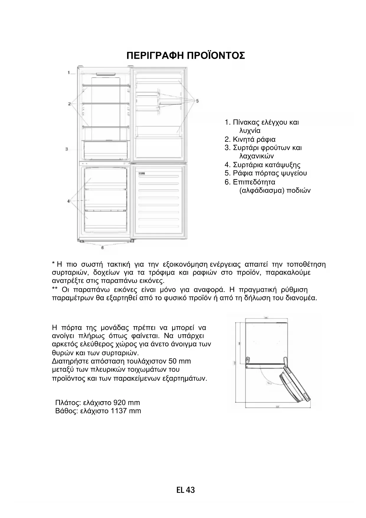 - Η πιο σωστή τακτική για την εξοικονόμηση ενέργειας απαιτεί την τοποθέτηση συρταριών, δοχείων για τα τρόφιμα και ραφιών στο προϊόν, παρακαλούμε ανατρέξτε στις παραπάνω εικόνες. ** Οι παραπάνω εικόνες είναι μόνο για αναφορά. Η πραγματική ρύθμιση παραμέτρων θα εξαρτηθεί από το φυσικό προϊόν ή από τη δήλωση του διανομέα. Η πόρτα της μονάδας πρέπει να μπορεί να ανοίγει πλήρως όπως φαίνεται. Να υπάρχει αρκετός ελεύθερος χώρος για άνετο άνοιγμα των θυρών και των συρταριών. Διατηρήστε απόσταση τουλάχιστον 50 mm μεταξύ των πλευρικών τοιχωμάτων του προϊόντος και των παρακείμενων εξαρτημάτων. Πλάτος: ελάχιστο 920 mm Βάθος: ελάχιστο 1137 mmEL 44