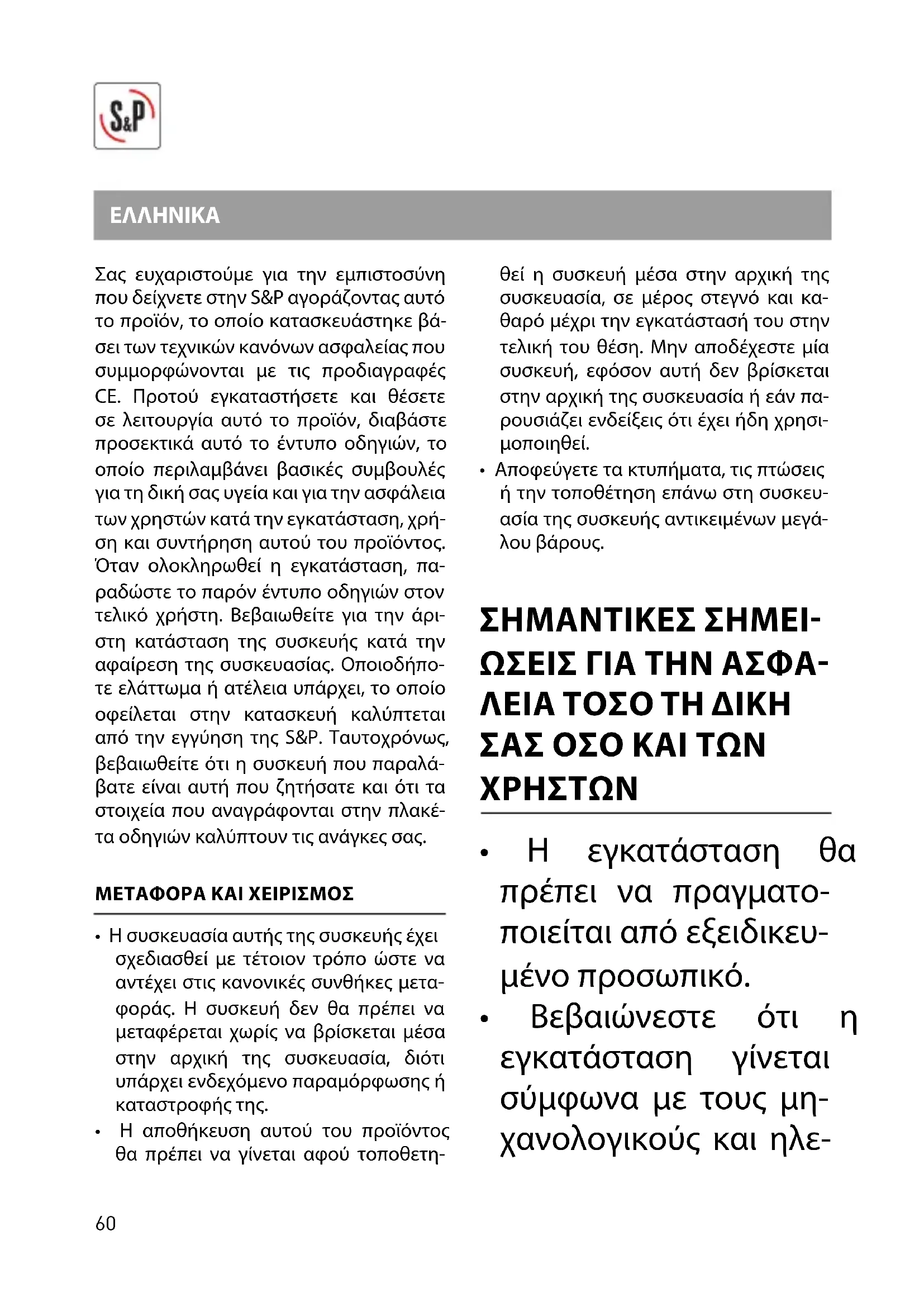 EEB teisės aktai ir svarstymas apie mūsų ateities kartas reiš- kia, kad turėtume visada per- dirbti medžiagas, kai tai įmano- ma; prašome nepamirškite, kad visas pakuotes reikia pristatyti į atitinka- mas perdirbimo dėžes,jokių būdu neiš- meskite kartu su buitinėmis atliekomis. Jei jūsų prietaisas taip pat paženklintas šiuo simboliu, prietaisą,pasibaigus jo ga- liojimo/naudojimo laikui, atiduokite serti- kuotai atliekų utilizavimo įmonei. Kreipkitės į Paslaugų Po Pardavimo Tinklą tam kad išsiaiškinti bet kokią59 abejonę dėl S&P produktų, jei tai yra Ispanijos teritorijoje arba į savo įprastą distributorių likusiame pasaulyje. Rasti savo distributorių galite puslapyje WEB www.solerpalau.com60 Σας ευχαριστούμε για την εμπιστοσύνη που δείχνετε στην S&P αγοράζοντας αυτό το προϊόν, το οποίο κατασκευάστηκε βά- σει των τεχνικών κανόνων ασφαλείας που συμμορφώνονται με τις προδιαγραφές CE. Προτού εγκαταστήσετε και θέσετε σε λειτουργία αυτό το προϊόν, διαβάστε προσεκτικά αυτό το έντυπο οδηγιών, το οποίο περιλαμβάνει βασικές συμβουλές για τη δική σας υγεία και για την ασφάλεια των χρηστών κατά την εγκατάσταση, χρή- ση και συντήρηση αυτού του προϊόντος. Όταν ολοκληρωθεί η εγκατάσταση, πα- ραδώστε το παρόν έντυπο οδηγιών στον τελικό χρήστη. Βεβαιωθείτε για την άρι- στη κατάσταση της συσκευής κατά την αφαίρεση της συσκευασίας. Οποιοδήπο- τε ελάττωμα ή ατέλεια υπάρχει, το οποίο οφείλεται στην κατασκευή καλύπτεται από την εγγύηση της S&P. Ταυτοχρόνως, βεβαιωθείτε ότι η συσκευή που παραλά- βατε είναι αυτή που ζητήσατε και ότι τα στοιχεία που αναγράφονται στην πλακέ- τα οδηγιών καλύπτουν τις ανάγκες σας. ΜΕΤΑΦΟΡΑ ΚΑΙ ΧΕΙΡΙΣΜΟΣ