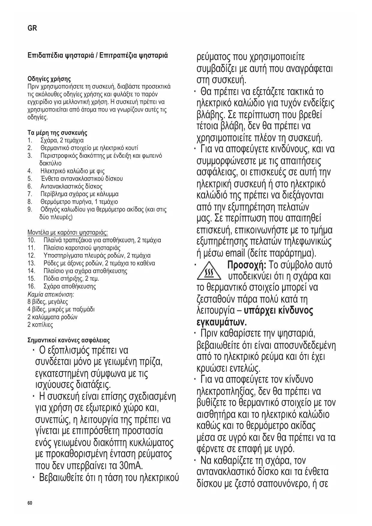 ∙ Ησυσκευήαυτήπροορίζεταιγια οικιακήχρήσηήπαρόμοιεςχρήσεις, όπωςγιαπαράδειγμα: - σεκουζίνεςεταιρειών,σεγραφεία καιάλλαεργασιακάπεριβάλλοντα, - σεγεωργικέςεταιρείες, - απόπελάτεςσεξενοδοχεία, πανδοχείακτλ.καιπαρόμοιες εγκαταστάσεις, - σεξενώνεςπουσερβίρουνπρωινό. ∙ Ησυσκευήαυτήμπορείνα χρησιμοποιηθείαπόπαιδιά (τουλάχιστον8ετών)καιαπόάτομα μεμειωμένεςφυσικές,αισθητήριεςή διανοητικέςικανότητεςήχωρίςπείρα καιγνώσεις,μετηνπροϋπόθεση ότιεπιτηρούνταιήτουςέχουνδοθεί οδηγίεςσχετικάμετηχρήσητης συσκευήςκαικατανοούνπλήρως όλουςτουςεμπλεκόμενουςκίνδυνους καιπροφυλάξειςγιατηνασφάλεια. ∙ Ταπαιδιάδενπρέπειναεπιτρέπεται ναπαίζουνμετησυσκευή. ∙ Δενπρέπειναεπιτρέπεταισταπαιδιά ναεκτελούνοποιαδήποτεεργασία καθαρισμούήσυντήρησηςστη συσκευήεκτόςεάνεπιτηρούνταικαι είναιτουλάχιστον8ετών. ∙ Κρατήστεπάντατησυσκευήκαιτο ηλεκτρικόκαλώδιότηςμακριάαπό παιδιάκάτωτων8ετών. ∙ Προσοχή!Ταπαιδιάπρέπειναπαραμένουνμακριά απόταυλικάσυσκευασίας,επειδήείναιδυνητικώς επικίνδυνα,π.χ.κίνδυνοςασφυξίας. ∙ Πρινχρησιμοποιήσετετησυσκευή,θαπρέπεινα ελέγξετεπροσεκτικάτηνκύριαμονάδα,καθώςκαικάθε εξάρτημα,γιατυχόνελαττώματα.Ανησυσκευή,για παράδειγμα,έχειπέσεισεσκληρήεπιφάνεια,δενθα πρέπειναχρησιμοποιηθείξανά,ακόμηκιανηζημιά δενφαίνεταιότιμπορείναπροκαλέσειπροβλήματα στηνασφαλήλειτουργίατηςσυσκευής. ∙ Κατάτηλειτουργία,ηψησταριάθαπρέπειναβρίσκεται τοποθετημένησεεπίπεδηεπιφάνειαπουαντέχειστη θερμότητακαιδενθακαταστραφείαπόλεκέδες.Όταν ψήνετετροφέςμευψηλήπεριεκτικότηταλίπουςή υγρασίας,δενείναιπάντοτεδυνατόνααποφεύγετετα πιτσιλίσματα. ∙ Μηντοποθετείτετηνψησταριάδίπλααπότοίχοήσε γωνίακαιναφροντίζετεναμηφυλάσσονταιεύφλεκτα υλικάκοντάσεαυτή. ∙ Ναθυμάστεότιτατρόφιμαμευψηλήπεριεκτικότητασε λίποςήυγρασίατείνουννααναφλέγονται.Συνεπώς, να γεμίζετε πάντα τον αντανακλαστικό δίσκο με νερό πριν από τη χρήση. Μην συνδέετε την ψησταριά στην κεντρική ηλεκτρική παροχή εάν δεν γεμίσετε πρώτα το δίσκο με νερό.Τονερόβοηθάει μετηνψύξητουαντανακλαστικούδίσκου,μειώνει τησυσσώρευσηκαπνούαλλάκαιδιευκολύνειτον