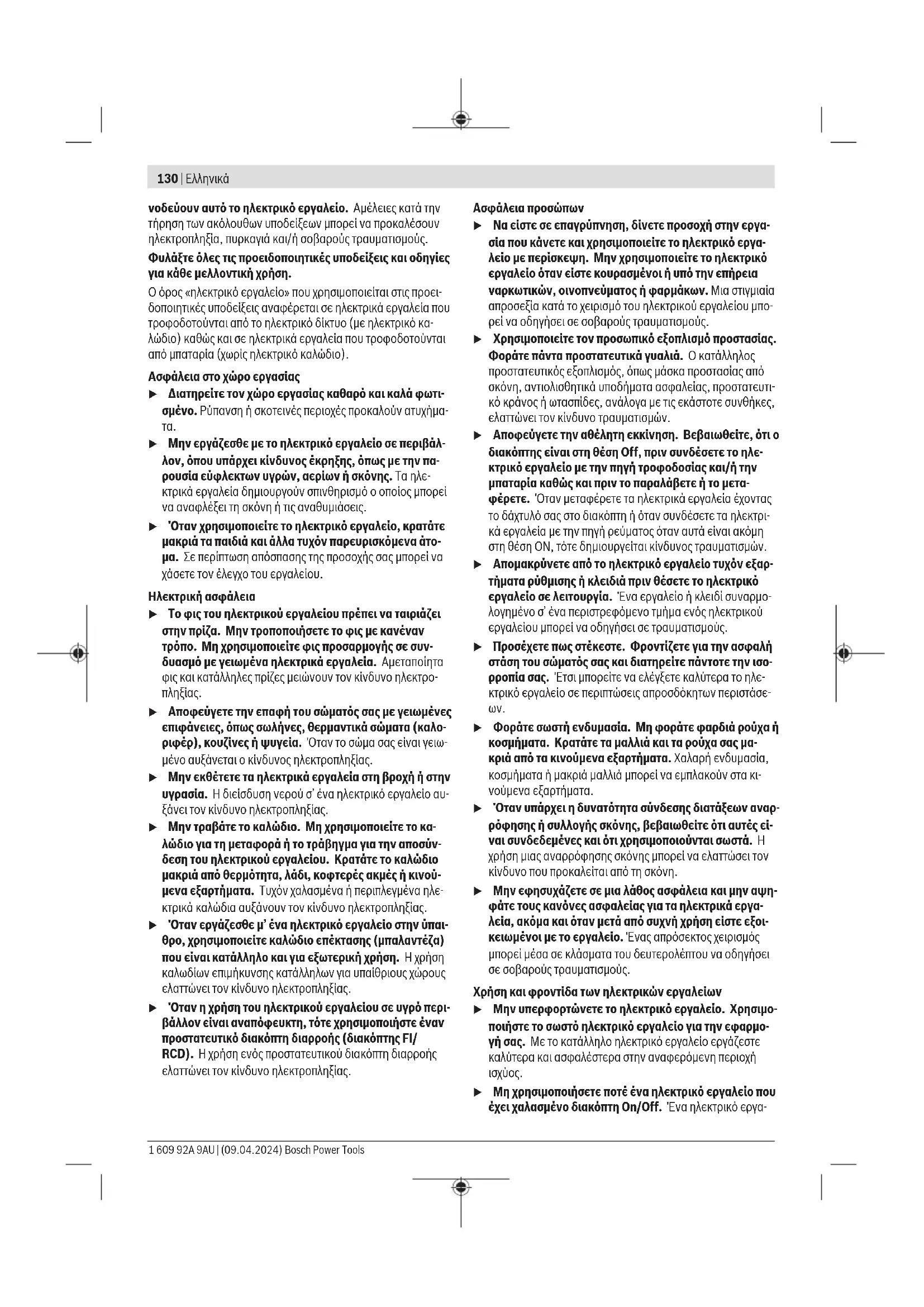 Διαβάστε όλες τις υποδείξεις ασφα-λείας, οδηγίες, εικονογραφήσειςκαι όλα τα τεχνικά στοιχεία, που συ-Bosch Power Tools 1 609 92A 9AU | (09.04.2024)130 | Ελληνικά νοδεύουν αυτό το ηλεκτρικό εργαλείο. Αμέλειες κατά την τήρηση των ακόλουθων υποδείξεων μπορεί να προκαλέσουν ηλεκτροπληξία, πυρκαγιά και/ή σοβαρούς τραυματισμούς. Φυλάξτε όλες τις προειδοποιητικές υποδείξεις και οδηγίες για κάθε μελλοντική χρήση. Ο όρος «ηλεκτρικό εργαλείο» που χρησιμοποιείται στις προει- δοποιητικές υποδείξεις αναφέρεται σε ηλεκτρικά εργαλεία που τροφοδοτούνται από το ηλεκτρικό δίκτυο (με ηλεκτρικό κα- λώδιο) καθώς και σε ηλεκτρικά εργαλεία που τροφοδοτούνται από μπαταρία (χωρίς ηλεκτρικό καλώδιο). Ασφάλεια στο χώρο εργασίας u Διατηρείτε τον χώρο εργασίας καθαρό και καλά φωτι- σμένο. Ρύπανση ή σκοτεινές περιοχές προκαλούν ατυχήμα-