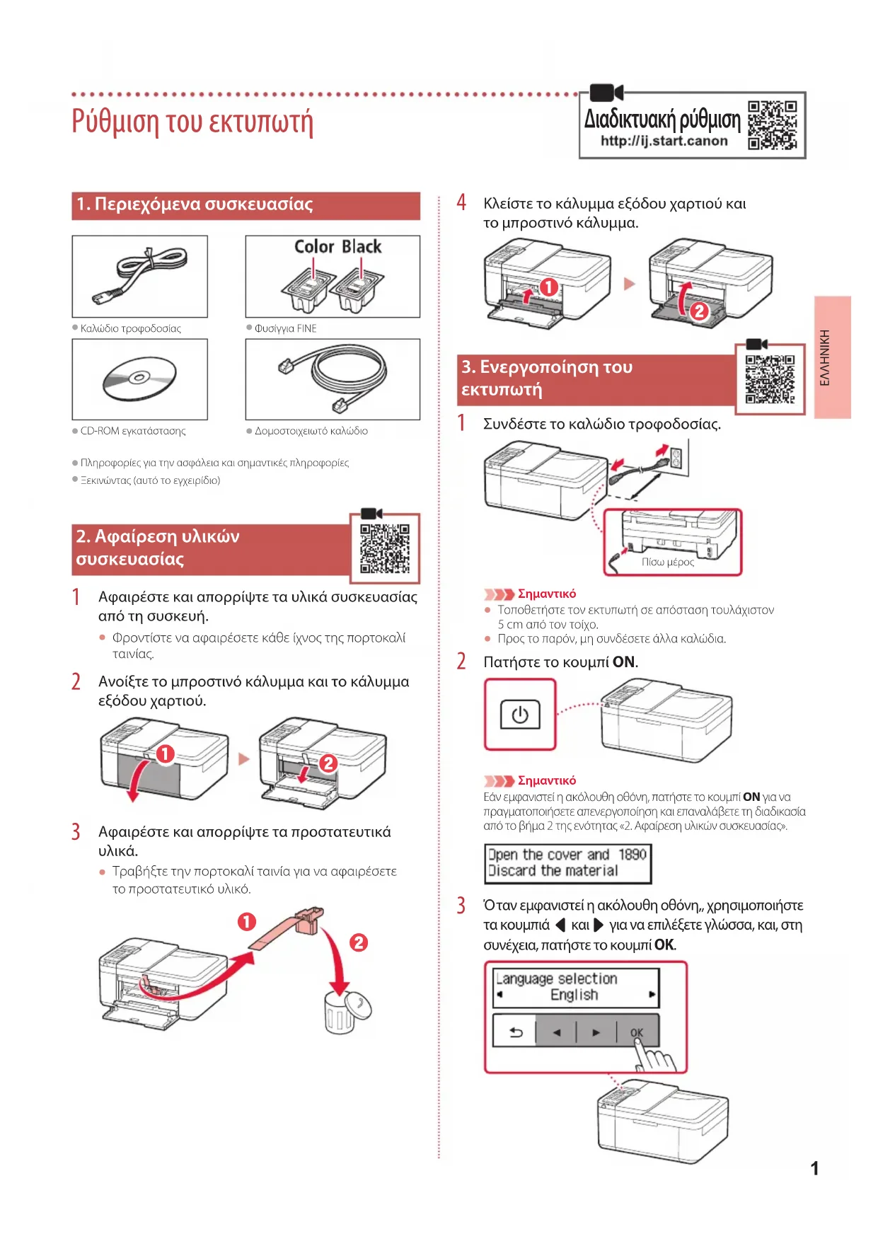 Τοποθετήστε τον εκτυπωτή σε απόσταση τουλάχιστον 5cm από τον τοίχο. Προς το παρόν, μη συνδέσετε άλλα καλώδια. Πατήστε το κουμπί ON. ΣημαντικόΕάν εμφανιστεί η ακόλουθη οθόνη, πατήστε το κουμπί ON για να πραγματοποιήσετε απενεργοποίηση και επαναλάβετε τη διαδικασία από το βήμα 2 της ενότητας «2. Αφαίρεση υλικών συσκευασίας».