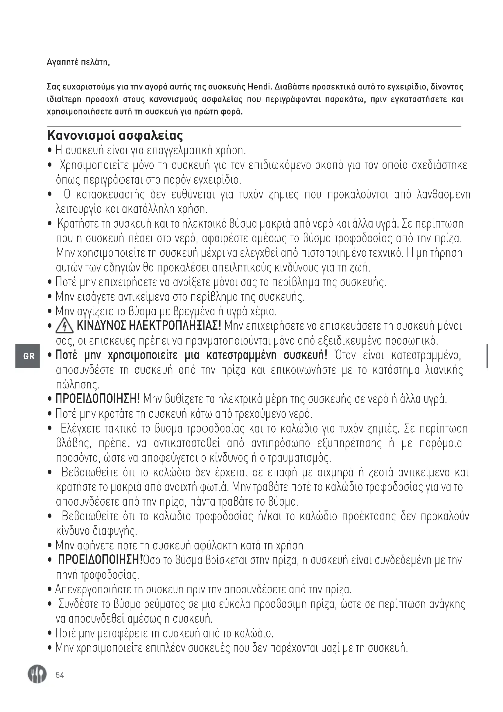 Αγαπητέ πελάτη, Σας ευχαριστούμε για την αγορά αυτής της συσκευής Hendi. Διαβάστε προσεκτικά αυτό το εγχειρίδιο, δίνοντας ιδιαίτερη προσοχή στους κανονισμούς ασφαλείας που περιγράφονται παρακάτω, πριν εγκαταστήσετε και χρησιμοποιήσετε αυτή τη συσκευή για πρώτη φορά. Κανονισμοί ασφαλείας