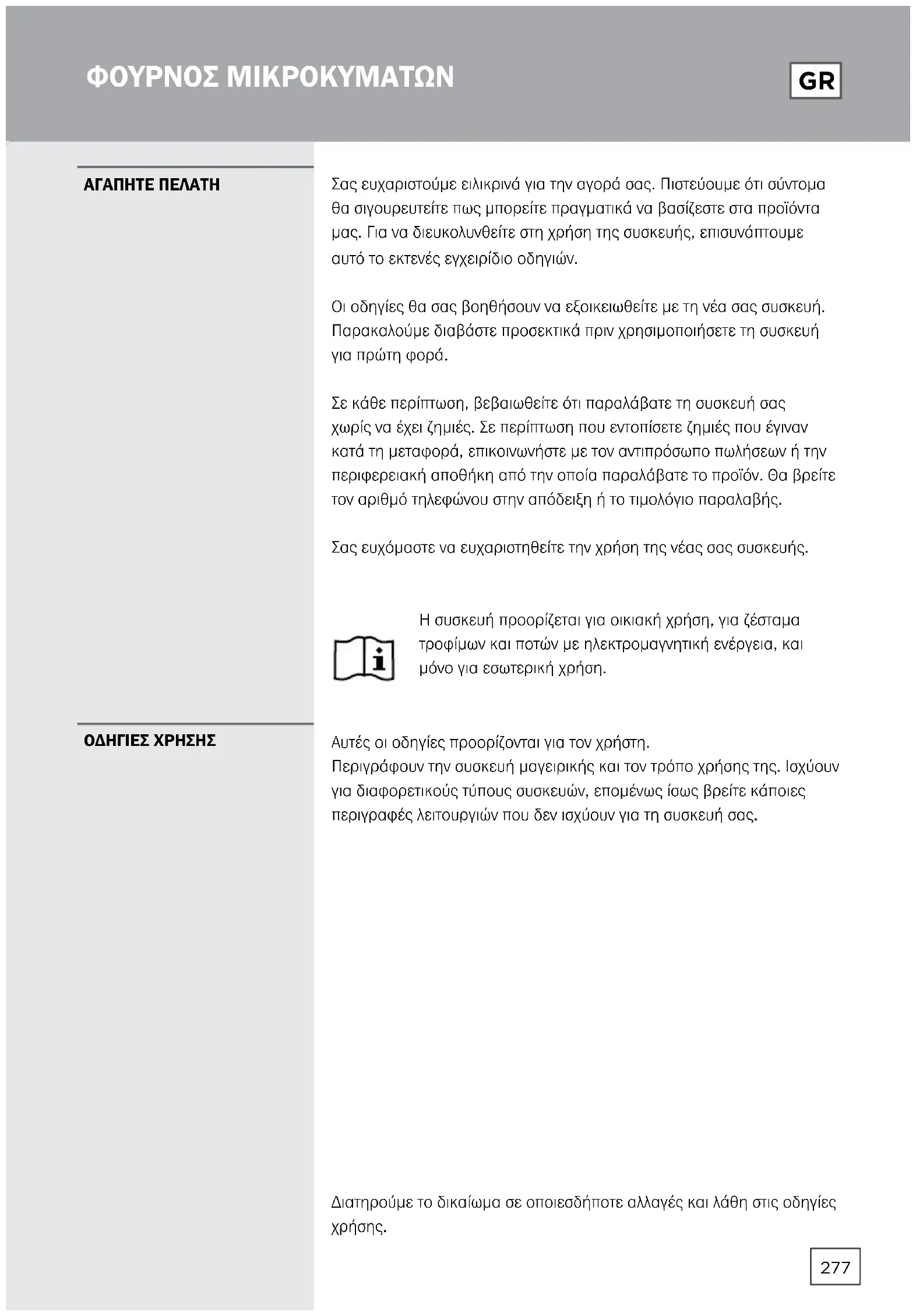 Σας ευχαριστούμε ειλικρινά για την αγορά σας. Πιστεύουμε ότι σύντομα θα σιγουρευτείτε πως μπορείτε πραγματικά να βασίζεστε στα προϊόντα μας. Για να διευκολυνθείτε στη χρήση της συσκευής, επισυνάπτουμε αυτό το εκτενές εγχειρίδιο οδηγιών. Οι οδηγίες θα σας βοηθήσουν να εξοικειωθείτε με τη νέα σας συσκευή. Παρακαλούμε διαβάστε προσεκτικά πριν χρησιμοποιήσετε τη συσκευή για πρώτη φορά. Σε κάθε περίπτωση, βεβαιωθείτε ότι παραλάβατε τη συσκευή σας χωρίς να έχει ζημιές. Σε περίπτωση που εντοπίσετε ζημιές που έγιναν κατά τη μεταφορά, επικοινωνήστε με τον αντιπρόσωπο πωλήσεων ή την περιφερειακή αποθήκη από την οποία παραλάβατε το προϊόν. Θα βρείτε τον αριθμό τηλεφώνου στην απόδειξη ή το τιμολόγιο παραλαβής. Σας ευχόμαστε να ευχαριστηθείτε την χρήση της νέας σας συσκευής. Η συσκευή προορίζεται για οικιακή χρήση, για ζέσταμα τροφίμων και ποτών με ηλεκτρομαγνητική ενέργεια, και μόνο για εσωτερική χρήση. Αυτές οι οδηγίες προορίζονται για τον χρήστη. Περιγράφουν την συσκευή μαγειρικής και τον τρόπο χρήσης της. Ισχύουν για διαφορετικούς τύπους συσκευών, επομένως ίσως βρείτε κάποιες περιγραφές λειτουργιών που δεν ισχύουν για τη συσκευή σας. Διατηρούμε το δικαίωμα σε οποιεσδήποτε αλλαγές και λάθη στις οδηγίες