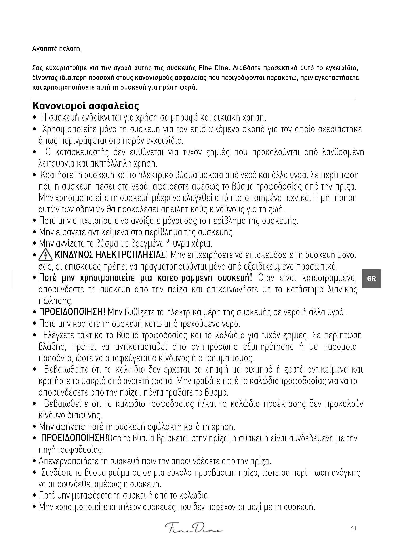 Αγαπητέ πελάτη, Σας ευχαριστούμε για την αγορά αυτής της συσκευής Fine Dine. Διαβάστε προσεκτικά αυτό το εγχειρίδιο, δίνοντας ιδιαίτερη προσοχή στους κανονισμούς ασφαλείας που περιγράφονται παρακάτω, πριν εγκαταστήσετε και χρησιμοποιήσετε αυτή τη συσκευή για πρώτη φορά. Κανονισμοί ασφαλείας