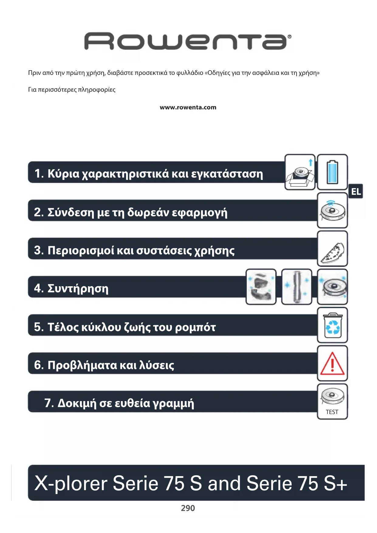 www.rowenta.com Πριν από την πρώτη χρήση, διαβάστε προσεκτικά το φυλλάδιο «Οδηγίες για την ασφάλεια και τη χρήση» Για περισσότερες πληροφορίες X-plorer Serie 75 S and Serie 75 S+