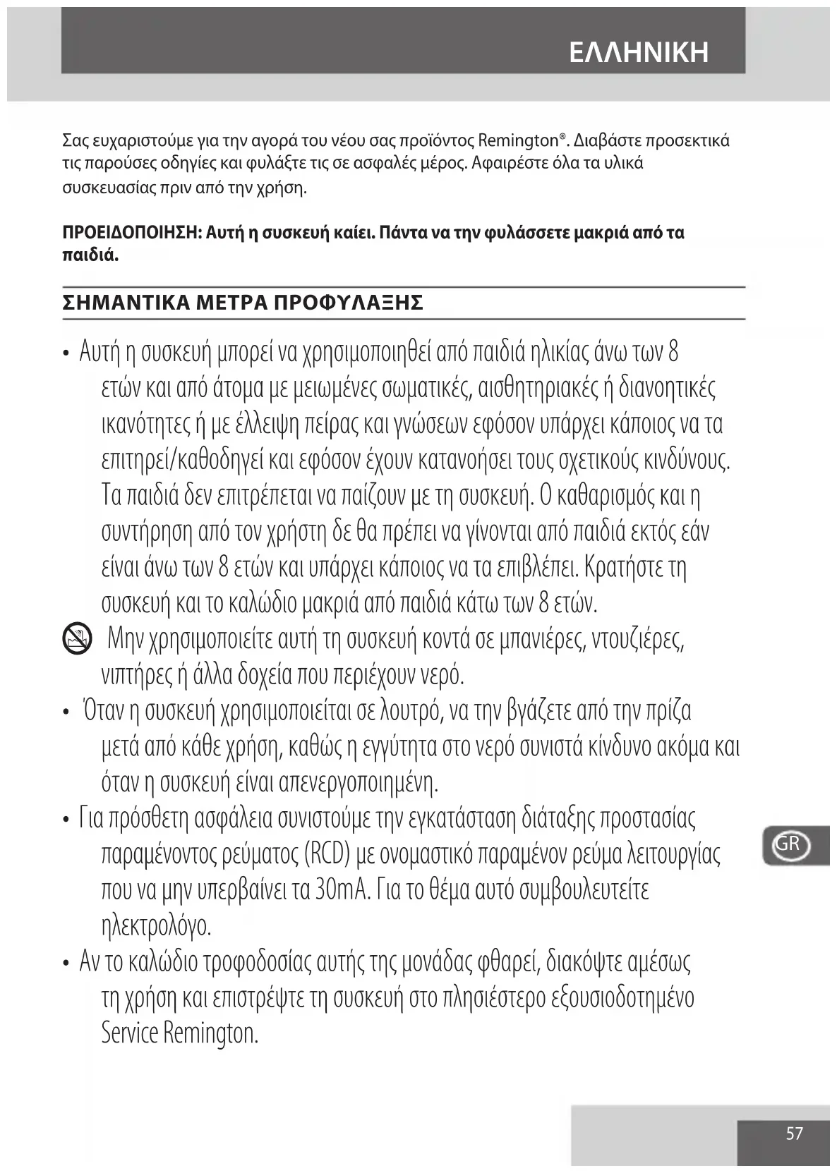 - Αν το καλώδιο τροφοδοσίας αυτής της μονάδας φθαρεί, διακόψτε αμέσως τη χρήση και επιστρέψτε τη συσκευή στο πλησιέστερο εξουσιοδοτημένο Service Remington.